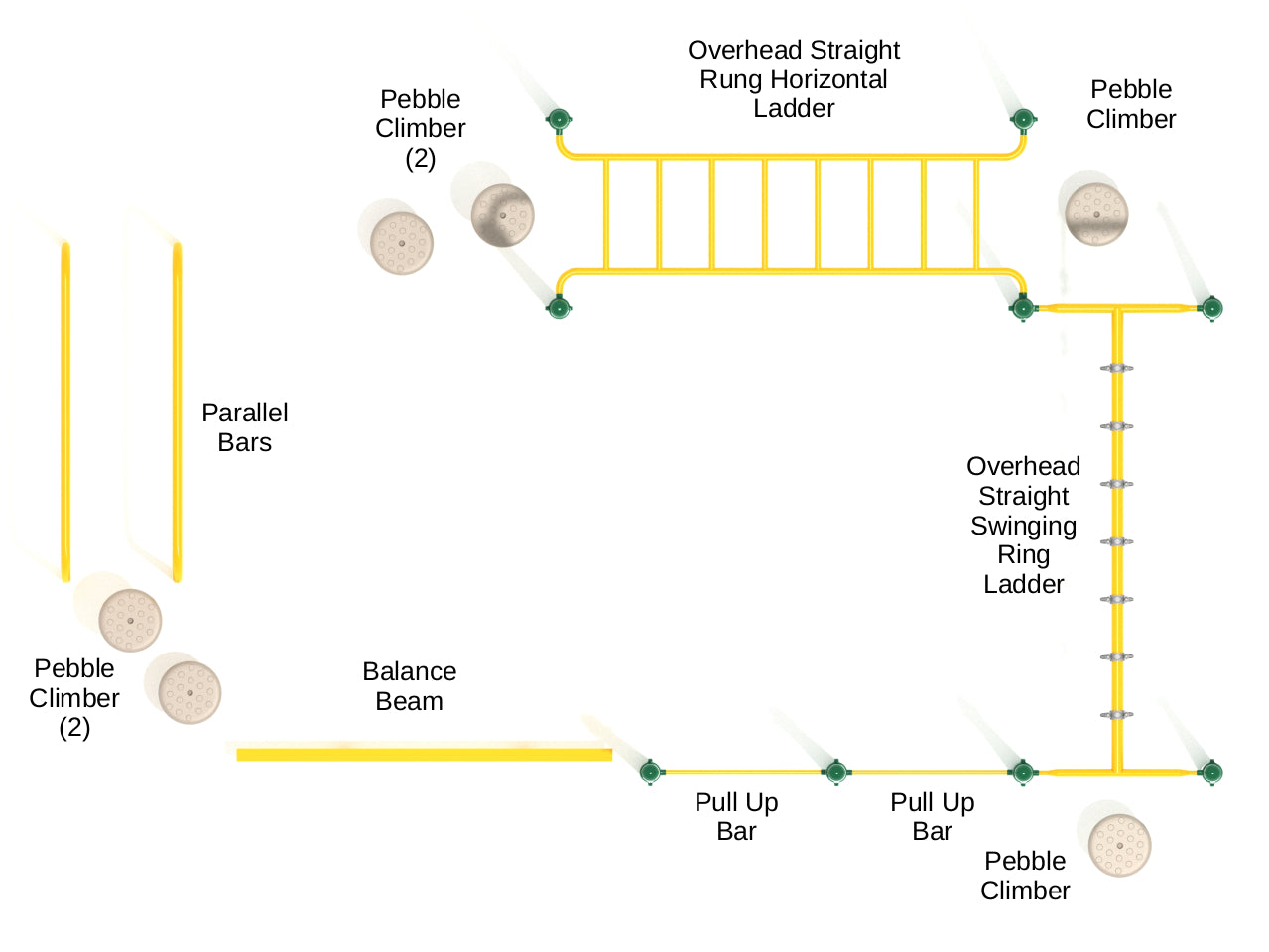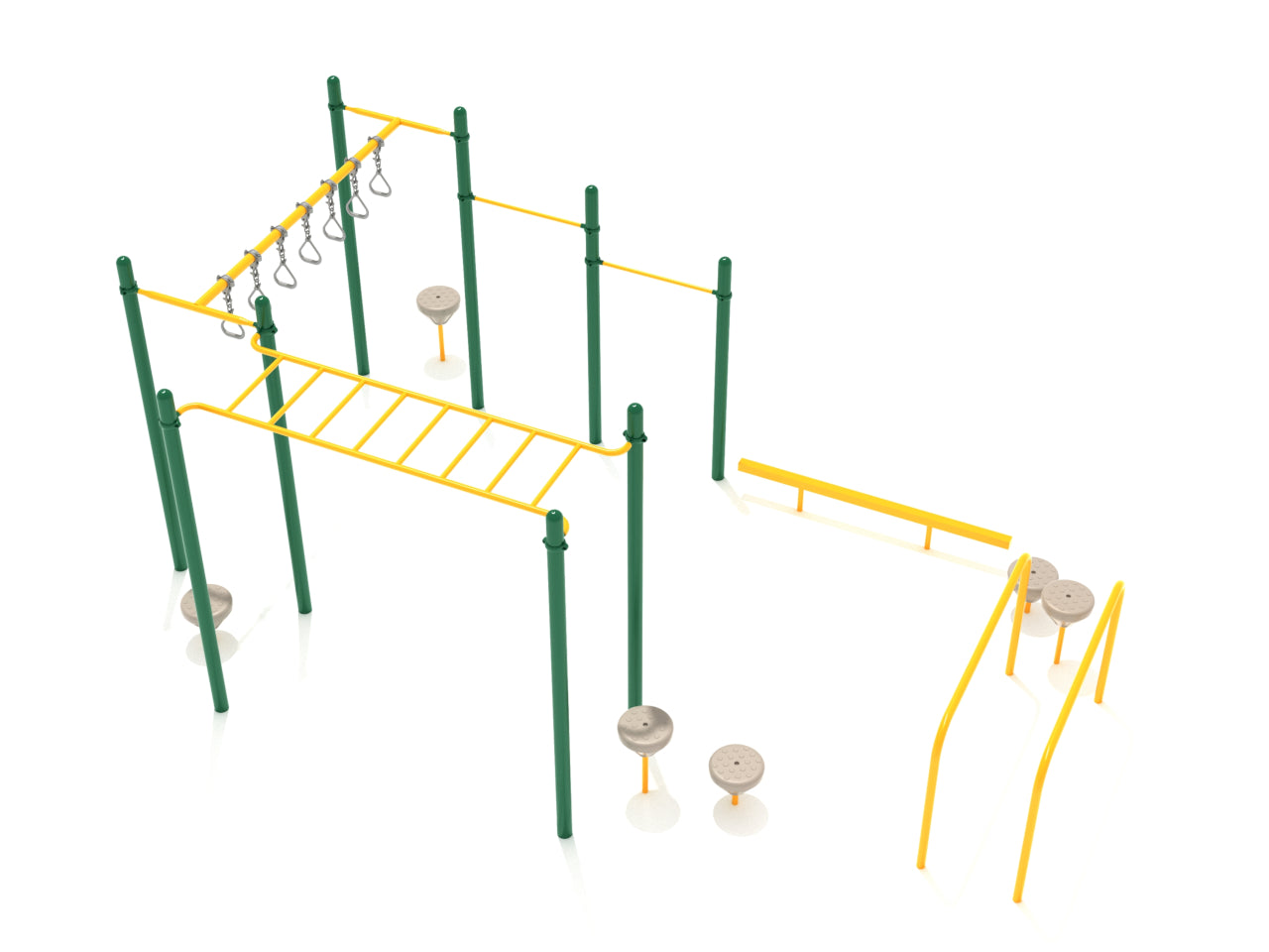 Alpharetta is less of a play system and more of a calisthenics course but for kids, of course. It has almost everything a kid needs to build their upper body strength. The course starts with two Parallel Bars that kids can use to practice headstands or work on their balance and coordination. Towards the end of the bars, kids can step on the Pebble Climber to reach the Balance beam. They can walk over it while maintaining their balance and eventually lead towards 2 Pull Up Bars of different heights. Kids can choose which Pull Up bar to use based on their height. Then comes the most challenging part of this course, the Overhead Staright Swinging Ring Ladder. Kids can think of themselves as commandos and swing their way across it to the Overhead Horizontal Ladder. They can rest for a little while and re-gather their energy to conquer this ladder and complete the course.