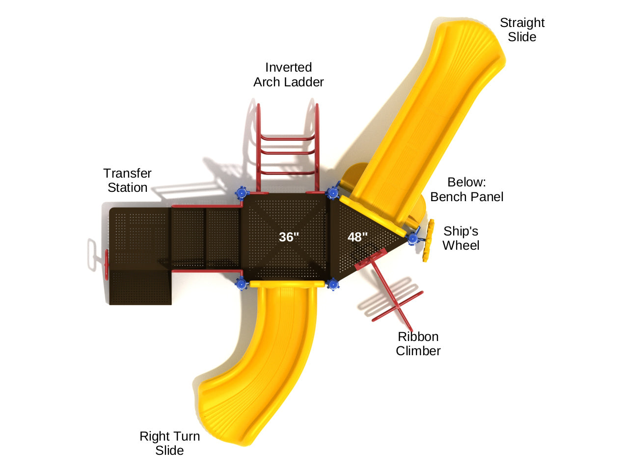 This compact Ames play system is great for playgrounds or daycare centers that don’t have a lot of space but still want to give children the ability to develop themselves physically and creatively. Aside from the Transfer Station which offers a gentle slope to access the equipment there are two more interesting ways to climb up. An Inverted Arch Ladder requires great hand-eye coordination as the curve towards the top means children have to balance their bodies in an unusual way and the Ribbon Climber has parallel bars to climb on which requires basic problem-solving abilities. When they’ve successfully scaled to the top they can choose from a Straight Slide for a quick, easy and fun descent to the ground, or opt for a twisty Right Turn Slide that requires them to keep their balance. A Ship’s Wheel is an excellent addition that lets children pretend to be the captain of a large ship on an ocean voyage or even a spaceship blasting off into outer space.
