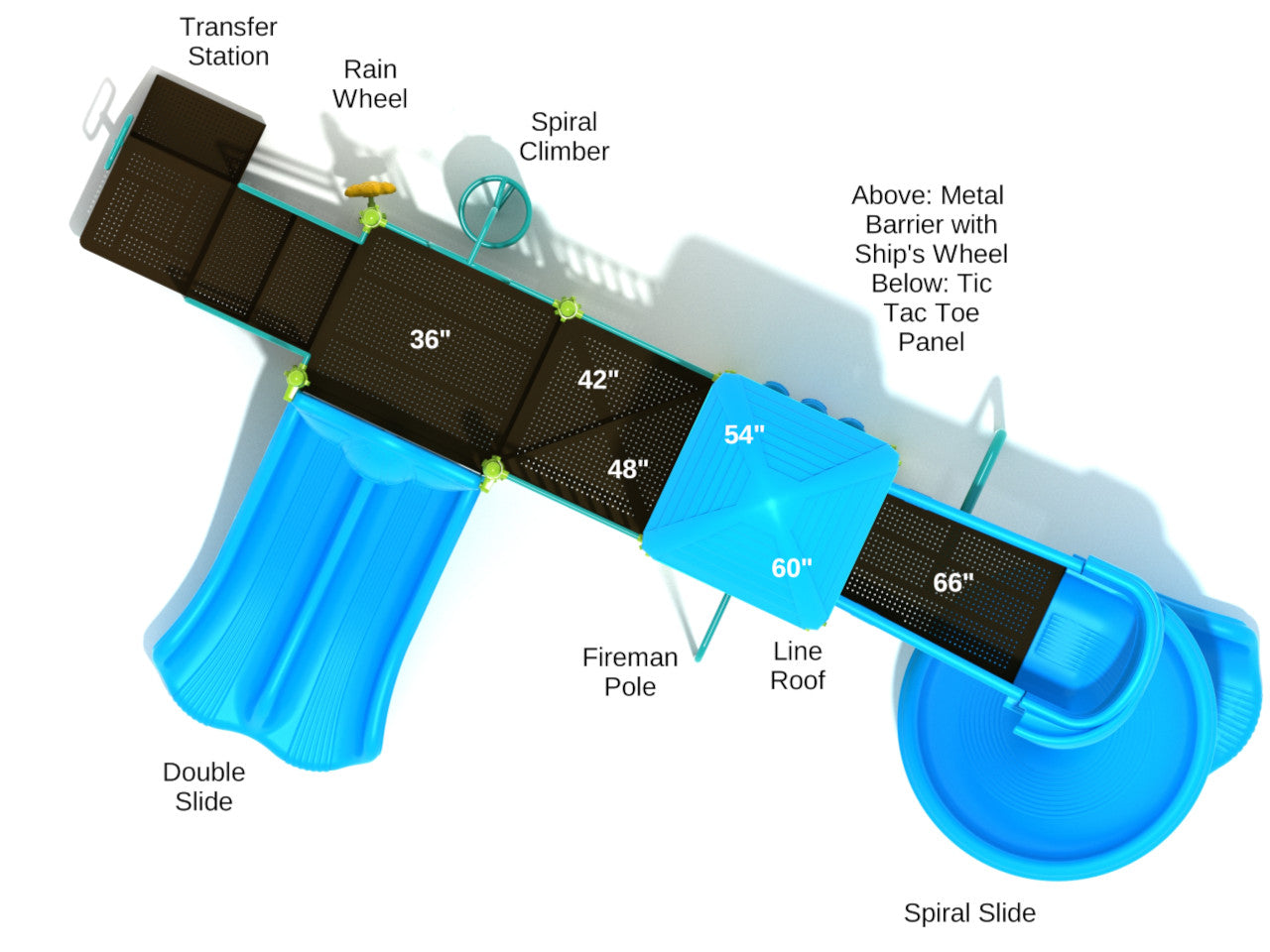 Annapolis Play system is just like a mini adventure park for kids in your playground. The first and the easiest entry point is the Transfer Station, which kids can use to get on the deck. Brave kids or kids with good climbing skills can also use the Spiral Climber or Fireman Pole to climb, as it challenges their strength and builds their upper body muscles. Once they climb the deck, they will find a Double Slide near the 36'' deck and a Spiral Slide near the 66'' deck. Kids can take a Double Slide with their friends, as it can accommodate 2 kids at once. But if they want more thrill and fun that comes with sliding down in circles, the Spiral Slide is the way to go. Once tired, they can grab the fireman's pole and zoom down like they are saving the day! For a quick break, little ones can play games on the Tic-Tac-Toe panel. All this thrill happens on a 3-foot high deck, which is just the right size for young ones.