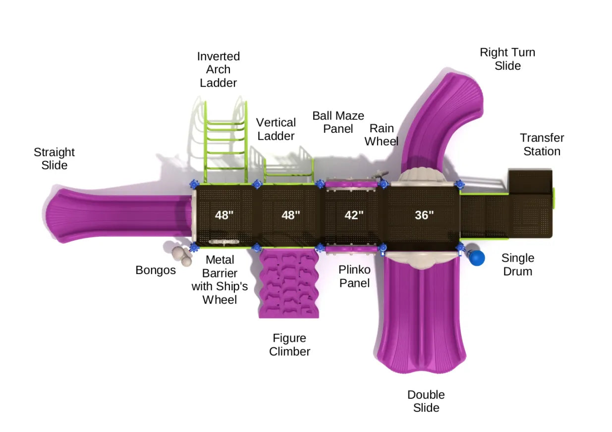Baberton is akin to a train of fun with slides and climbers on both sides of its linear structure. The easiest way to step onto this train is through the Transfer Station staircase. But if kids are feeling energetic, they can take the more thrilling climbers like the inclined rock-wall-themed Figure Climber or the rather easier Vertical and Inverted Arch Ladders. Kids pouring in from all sides will be greeted by the good-for-racing Double Slide, the gently curved Right Turn Slide, and the tallest Straight Slide. This thoughtful and equal placement of climbers and slides will ensure upper decks don’t get too crowded. Games like Ball Maze Panel and Plinko Panel are also placed on the deck so no kid stands idle if the slides aren’t free. A steerable Ship Wheel is also given to let kids feel they’re commanding a ship on a high wave. And to bring out their inner musicians, instruments like the Rain Wheel, Single Drum and Bongos are also available on Barberton. Who needs background music when kids can make their own?