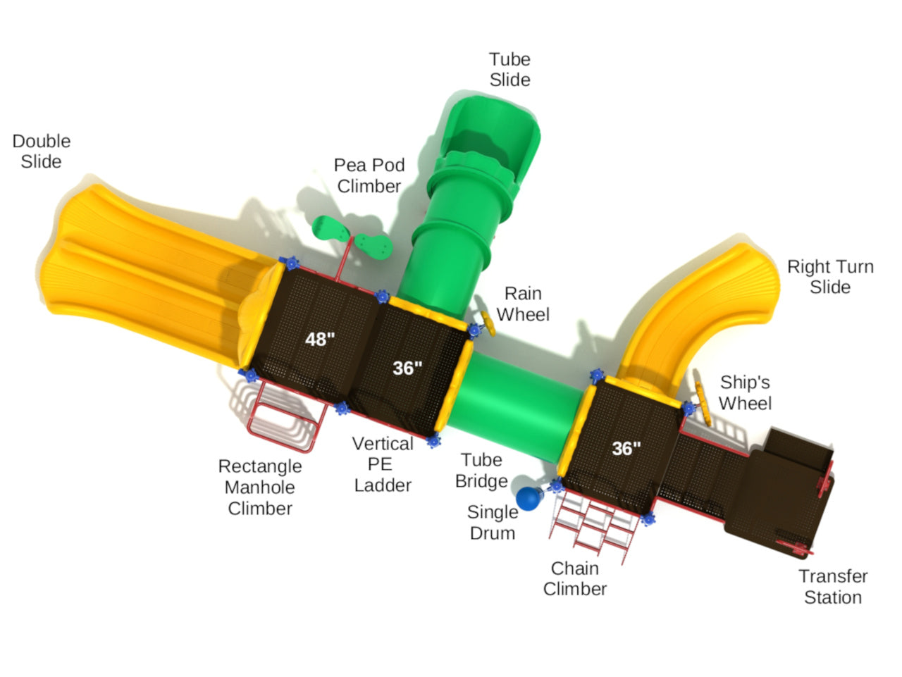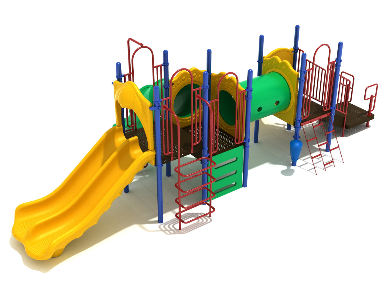 Baton Rouge is an elegant-looking play system that has a way of luring children with its aesthetically pleasing structure. It can keep kids active for hours. Climbing, exploring, sliding - the Baton Rouge Play System offers it all. First off, the Chain Climber, the Pea Pod Climber, and the Rectangular Manhole Climber are three unique options the kids can take to reach the top. All three options come with their own sets of challenges. It has two different slide styles as well, the Double Slide and the Right Turn Slide. The Double Slide can accommodate 2 kids at once. But wait, there’s more. The Tube Bridge, which looks like a Tunnel, separates the play structure into two parts, which makes it more exciting. On the ground floor, the children can access the Rain Wheel, the Ship’s Wheel, and the Single Drum for imaginative play. With something for everyone, this playground set is loved by all kids out there!