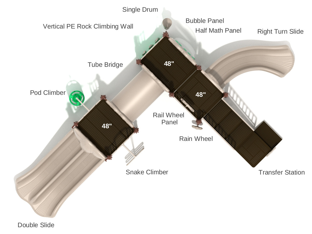 Every corner of the Beaufort Play Structure is about adventure. It makes playtime full of fun and surprises. Children can reach the top by taking the Pod Climber or the more challenging Snake Climber. The platform is only about 4-ft high, so it’s safe yet thrilling for young adventurers. The little ones can head straight to the slides or step inside the Tube Bridge to satisfy their urge to explore. The Tube Bridge is like a tunnel that makes kids feel like they are on a secret mission. The opposite platform is connected to a double slide, allowing the kids to zoom back down with their friends. Those who wish to climb back up again can also take the PE Rock Wall for an added challenge. The Beaufort Play Structure also has a Half Math Panel that encourages problem-solving. It’s a complete bundle of fun, excitement, and healthy activity, encouraging kids to push their limits safely!