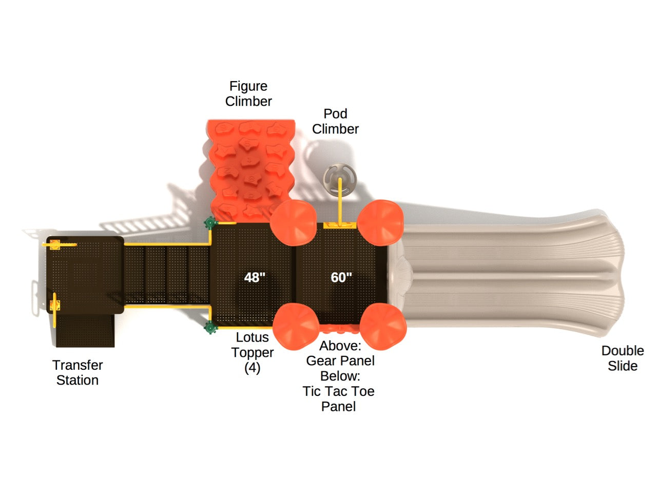 Kids will love to play beneath the tall poles with Lotus Toppers as they fiddle with the colorful and interactive Gear Panel or enjoy a friendly but competitive game of Tic Tac Toe to develop their strategic abilities. The Pod Climber will also provide both a mental and physical workout as they scale the disks to reach the upper platform. A Transfer Station provides access for children of all abilities and there’s a specially designed Figure Climber which boasts numerous jagged holds to propel children upwards or even climb down backwards for an added challenge. Learning about teamwork and coordination with friends is an equally important aspect of childhood and there’s no better way to do that than to challenge each other to a race down the Double Slide. The whole structure is designed to be outdoors for years so you can ensure the commercial-grade materials will stay looking their best for thousands of children to enjoy in its lifetime.