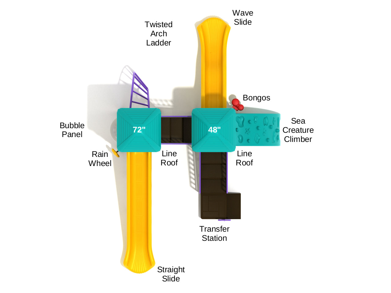 The Berwyn is a smart setup of slides and climbers on a 4-foot and 6-foot deck. Merely getting to the top of Berwyn is half the fun. The Twisted Arch Ladder, with its angled steps and winding design, adds just the right amount of difficulty to keep things interesting. Completing the 6-foot climb gives kids a bird’s-eye view of the playground before they launch themselves down the large Straight Slide. On the other side of the Berwyn, things get a little closer to the ground but are no less fun. The ocean-themed Sea Creature Climber is a challenging route up the 4-foot deck. Upon successfully climbing, the short Wavy Slide gives kids a bouncy ride down the platform, though with a safe landing. To make sure kids of all abilities can enjoy Berwyn, the Transfer Station stairway provides an easy way to the top. The fun also continues right at the ground level with the Rain Wheel and Bongos, allowing kids to add a fun soundtrack to their day.