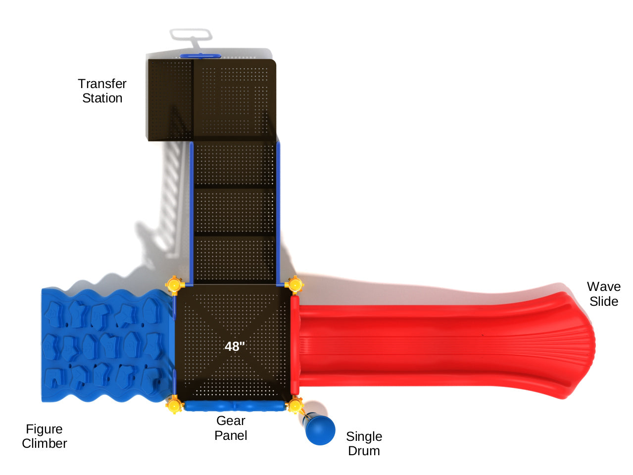 The Bismarck is one of the smaller and more basic sets of outdoor play equipment on offer, but by no means any less fun as it has lots of features that kids will adore. It boasts a long Wave Slide that has a double bump on the way down which sends kids wiggling and giggling with glee all the way down. Getting to the top of the structure is a challenge too if kids decide to put their mountaineering skills to the test on the Figure Climber. It features 16 angled rock holds for kids to place their feet on or use for leverage to pull themselves up. The Bismarck has a classic playground favorite, the Gear Panel with twisting mechanical cogs that work together to make motion and inspire cognitive development. Kids will love to give the Single Drum a bang and create rhythms as they pass by it, bringing a welcomed musical element to the structure.