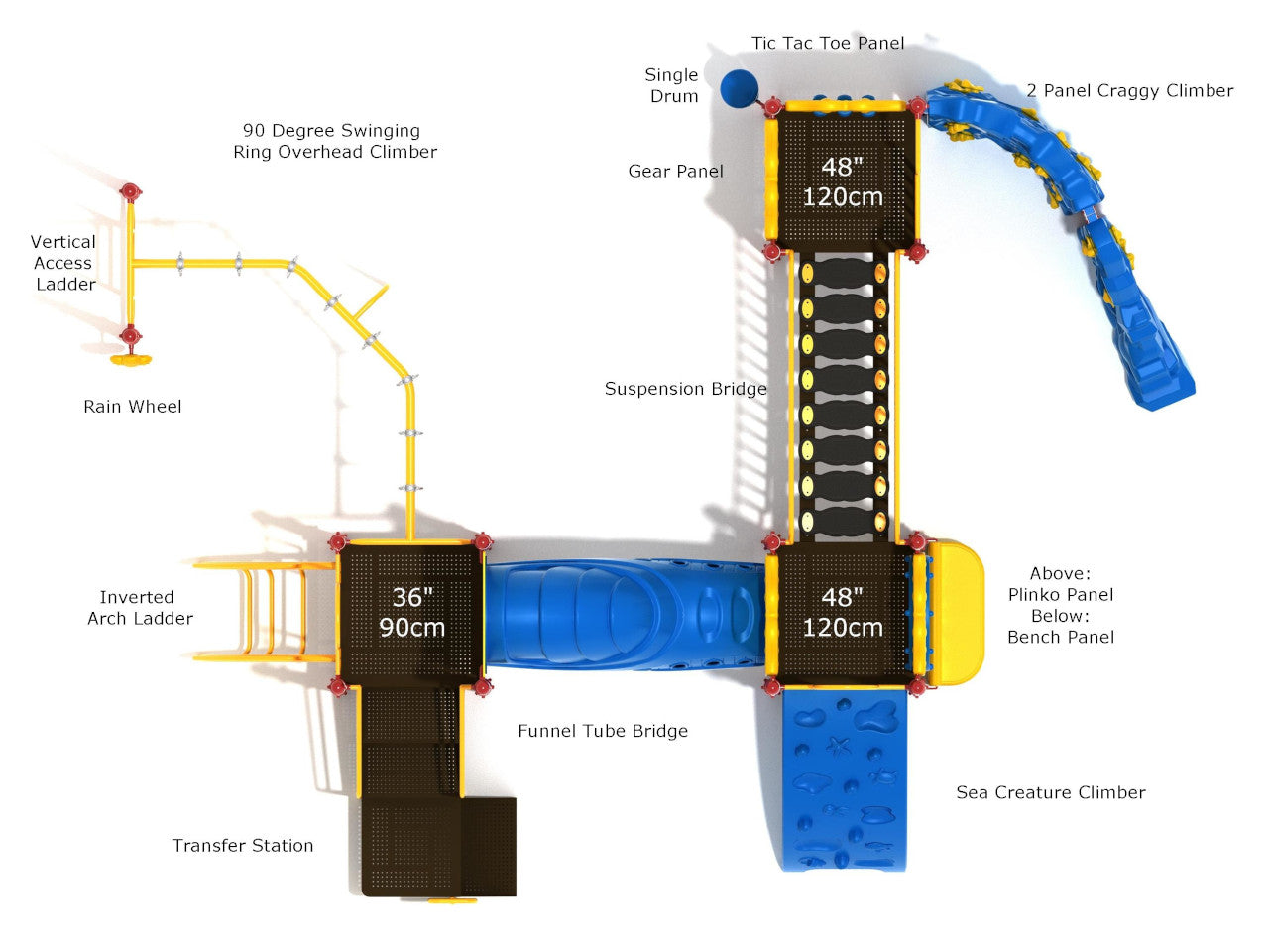 Want a unique play structure with no slides but ample playtime gadgets? The Blue Grass playground equipment has 2 Panel Craggy Climbers and a Sea Creature Climber. These 3 exciting climbers are enough to stimulate cognitive development in kids and enhance their problem-solving skills. The Suspension Bridge makes adventures on top of Blue Grass even more exciting. At the Rain Wheel, kids can pretend to be magicians, turning thunderstorms into mild sea breezes. The Vertical Access and Inverted Arch Ladders can transform young explorers into mountain climbers. They may try to scale a betraying peak or explore a jungle gym. Moving on, kids can showcase their knack for music at the Single Drum. However, fun reaches its zenith at the Plinko and Tic-Tac-Toe Panels. Friendly competitions there will hone their strategic thinking and teamwork skills. Don’t forget about the Funnel Tube Bridge here. A child can pretend to cross into different worlds here while stimulating their imagination and bonding with friends.