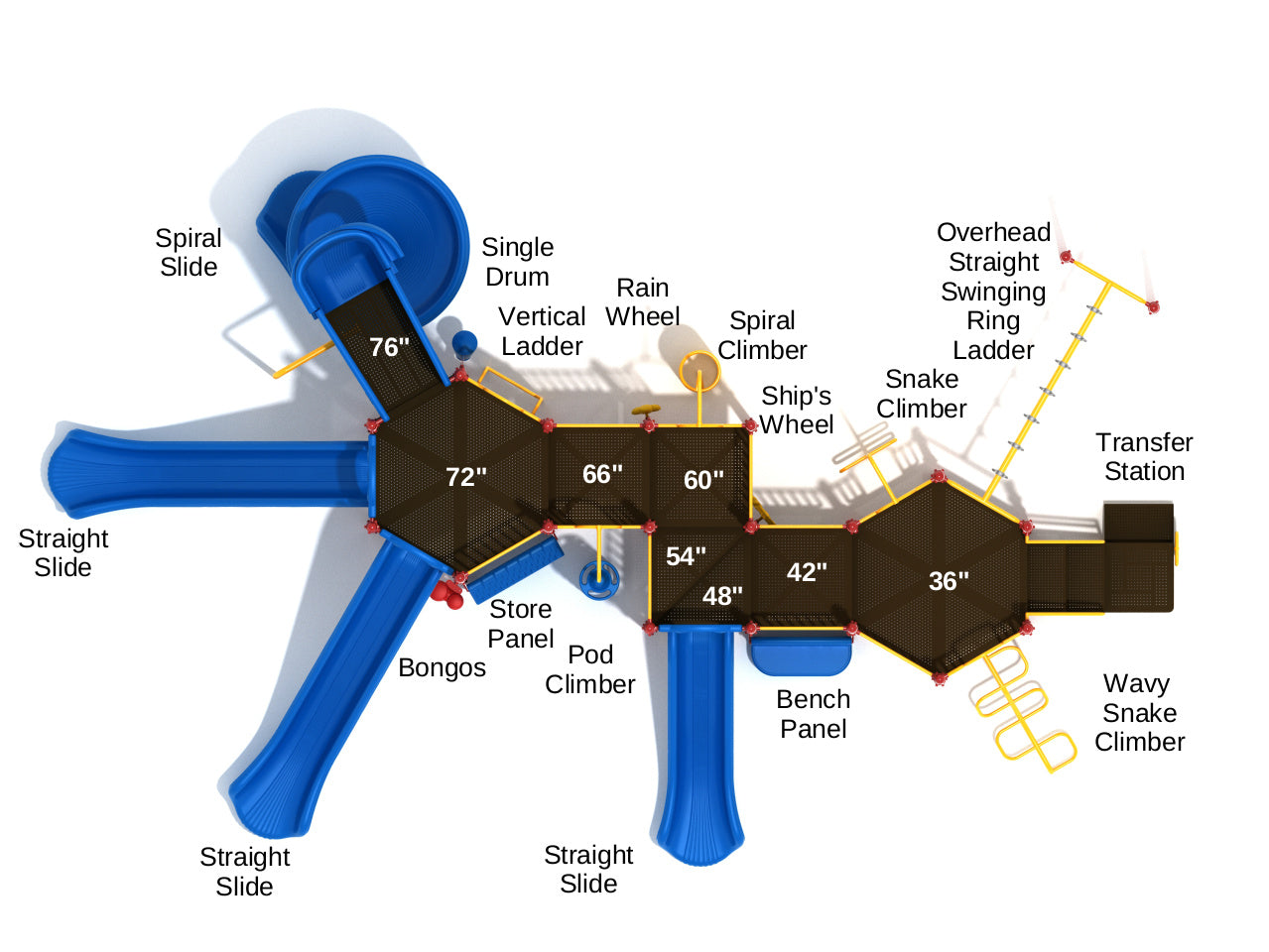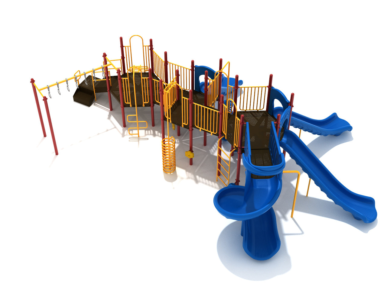 This massive play structure has multiple slides, activities, and amenities that’ll attract kids from afar! It is like a castle with mazes consisting of eye-pleasing surprises for young explorers. It can easily support huge crowds of kids, as many as 87 kids at once. It features two Snake Climbers and a Swinging Ring Ladder for entry. There are 2 hub areas for kids to be kids and have the time of their lives! Safe dismount areas reduce the risk of collisions. Also, Broken Arrow has ground-level features like the Store and Bench Panels for kids to chill, relax, and do a little socializing. There are 2 hub areas that lead to friendly competition that may take the shape of kids recreating Robin Hood-like adventures. The Spiral Slide and two Straight Slides offer thrilling sliding fun that kids might want to try over and over. The overall layout & variety of games support active play. Broken Arrow helps kids develop their motor skills while enjoying themselves in a safe environment.