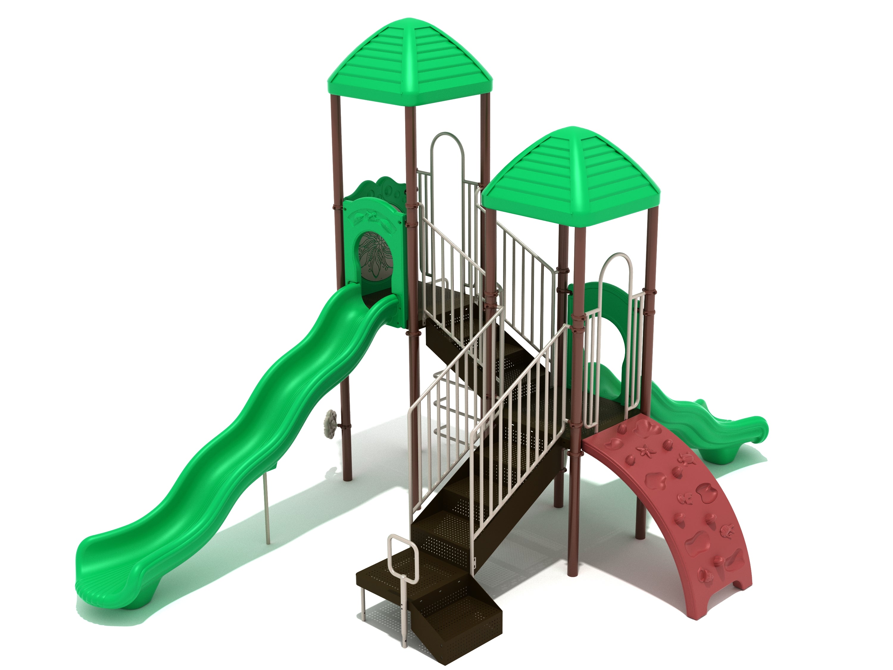 Although the Burbank is a compact unit it benefits from height that children will find a real challenge to scale. They can climb the Vertical Ladder to reach the top, ideal for children just learning to climb, or they can choose to access it via the Transfer Station and take the stairs. One other way is possible too which is going to prove the most popular. The Sea Creature Climber has 3D turtles, starfish and jellyfish to grab onto to inspire an underwater adventure as well as indentations to give feet a space to provide much-needed boost. The Burbank has two slides to choose from. A smaller Wave Slide just above the Single Drum is one way to get down but children are much more likely to climb the extra few steps and bump down the larger, higher, longer and faster Wave Slide. Both platforms are covered by a Line Roof to keep the rain and sun off the structure and a Rain Wheel is perfect for making tropical rainforest downpours occur with a spin of the wheel.