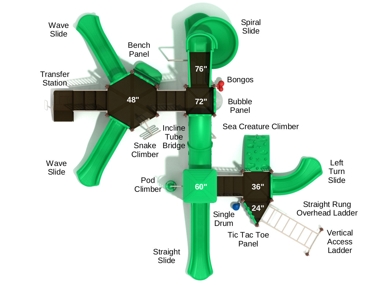 The adventure starts on the ground level with the Chagrin Falls play structure as dotted around the base are Bongos, a Bench Panel and a Single Drum as well as a Tic Tac Toe Panel to help develop cognitive abilities. Climbing onto the structure can be done in many ways to give kids the choice of easy, medium or hard. Starting off easy they can choose the Transfer Station or the Snake Climber which is accessible for all ages, but for a medium level difficulty they can opt for a slightly trickier ascent on the Pod Climber where balance and skill are required. The Sea Creature Climber will be hard for younger children but a breeze for older ones as they race up the face of it. Every child will relish the challenge of the Straight Rung Overhead Ladder which is reached by a Vertical Access Ladder. After swinging their whole body weight across 6 bars they’ll reach the platform where the fun doesn’t stop. Five slides await them including two Wave Slides and a Spiral Slide. An Incline Tube Bridge joins the platforms and there’s a Bubble Panel to look out of across the playground.