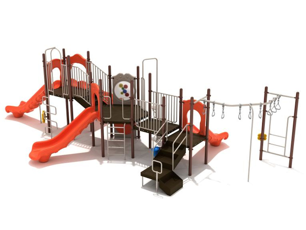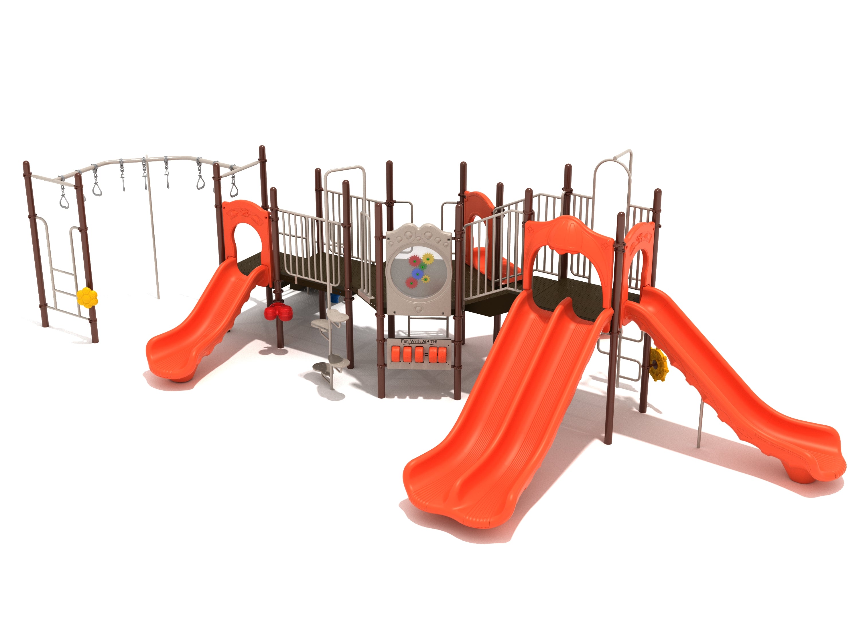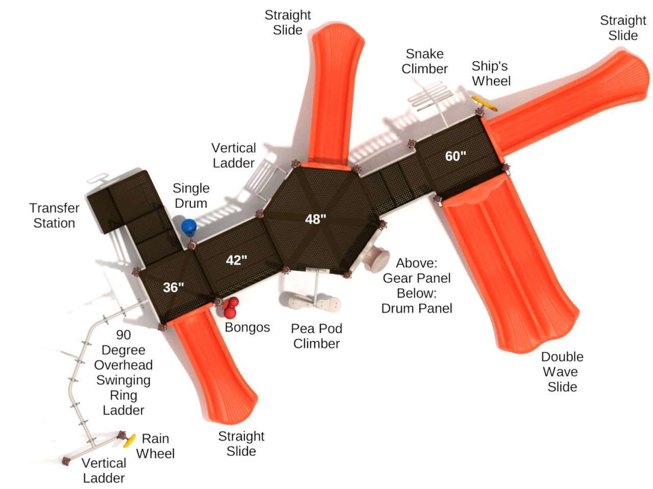With three Straight Slides and a bumpy Double Wave Slide to enjoy, kids will be truly spoiled for choice on the Corvallis play equipment when installed in a public park or school playground. Even though there is a Vertical Ladder and Transfer Station to use in order to scale the equipment, we can guarantee that the tricky Pea Pod Climber with alternating platforms and the Snake Climber which spirals up the side of the structure are going to be the most popular routes up and down. However, you can also be sure that the 90 Degree Overhead Swinging Ring Ladder is going to have kids lining up to use it as it brings a real challenge to any play set. The set includes a Drum Panel, Bongos and Single Drum for creating deep, booming sounds and a Gear Panel inspires creativity and problem-solving. There’s a Ship’s Wheel for adventurous children to take control of their very own sea-faring vessel and head out onto open water.