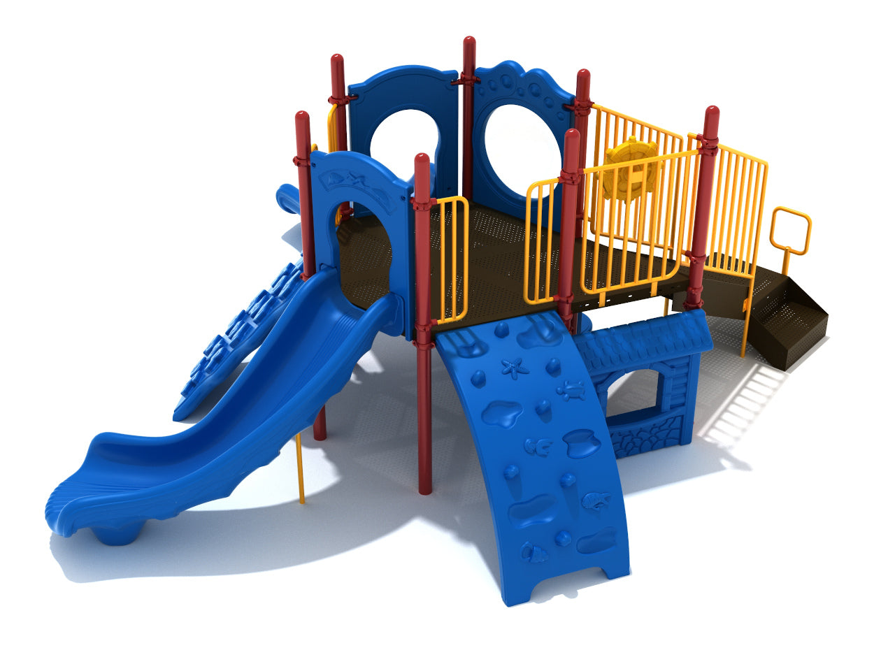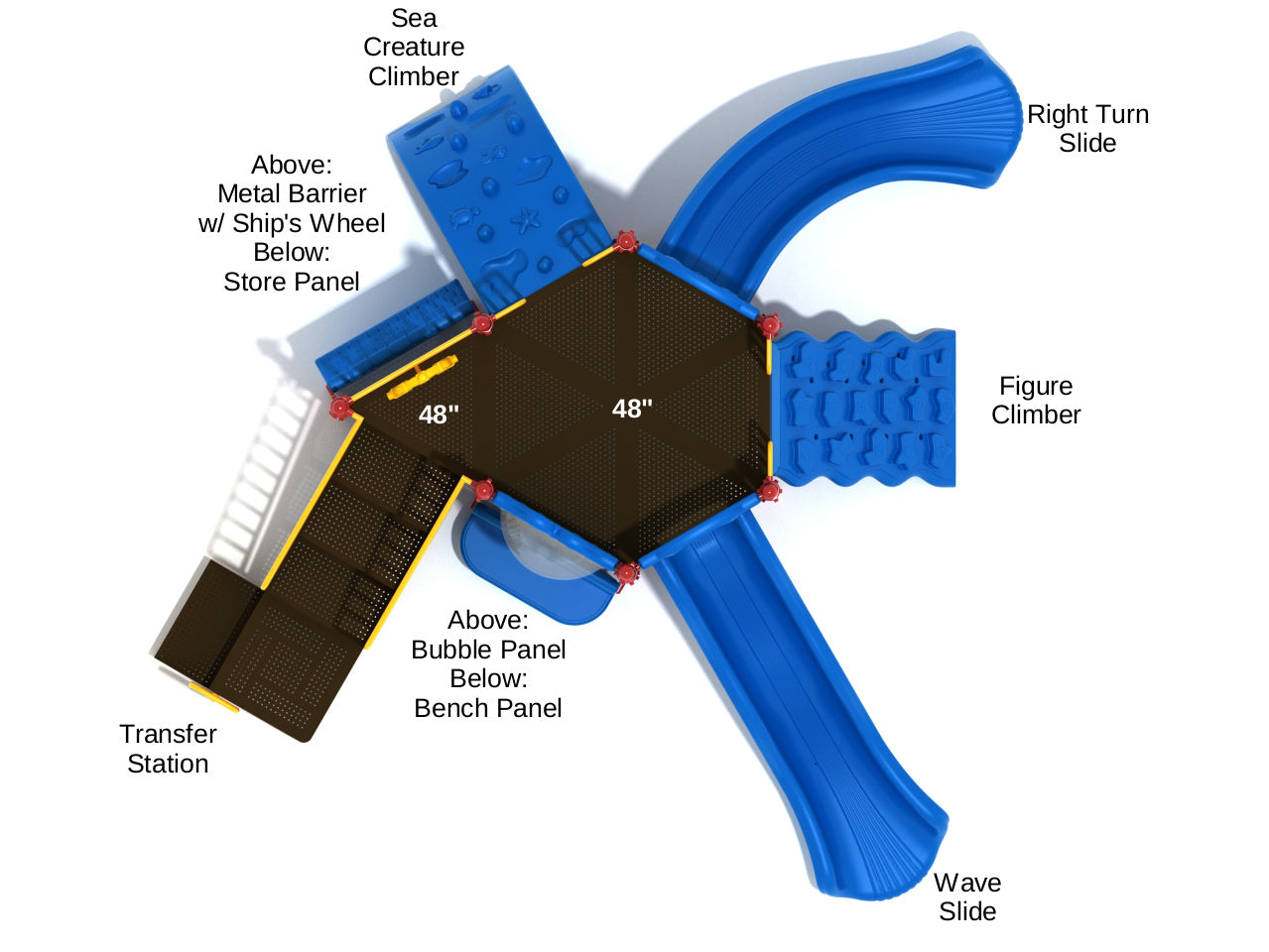 Whether they’re crawling, climbing, sliding or running around, children are guaranteed to have a blast on the Costa Mesa play set. Kids can burn their energy climbing up the angular holds of the Figure Climber to get to the top or they can go on an oceanic adventure if they choose the Sea Creature Climber featuring jellyfish holds. At the top of the structure there’s a Bubble Panel which could easily be imagined as the portal of a submarine searching for creatures on the ocean floor, and the nautical theme is continued thanks to a Metal Barrier with Ship’s Wheel for pirate captains. Getting down has never been so much fun and kids can choose between a twisty Right Turn Slide or a bouncy Wave Slide. On the lower level there’s a Store Panel for roleplaying activities between friends that will have them lining up with their shopping carts for groceries, and a Bench Panel so they can sit and enjoy the surroundings when their energy levels inevitably dip from all the fun they’re having.