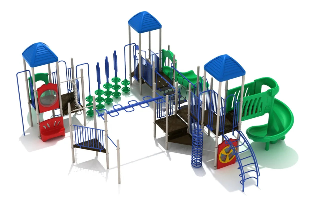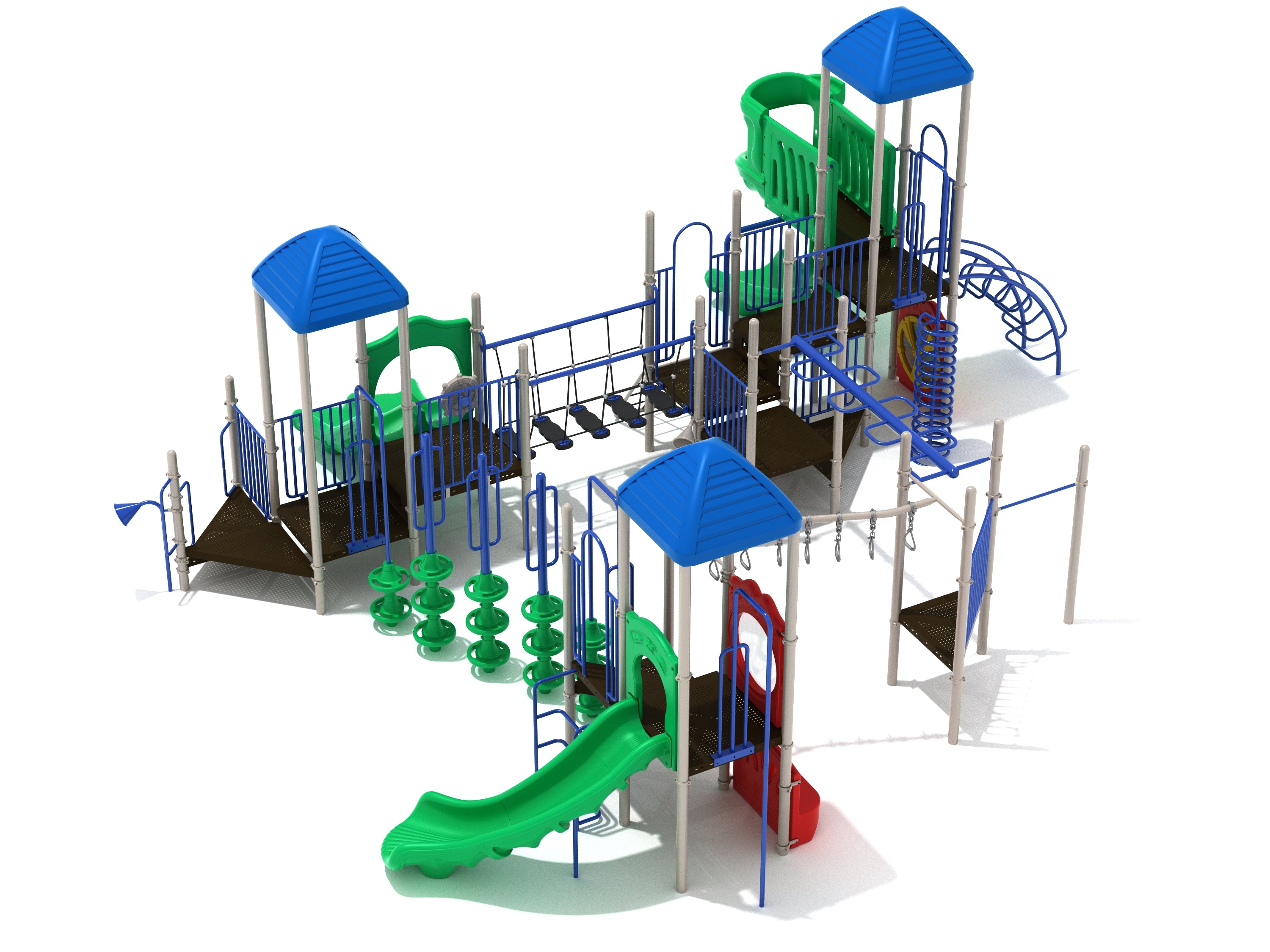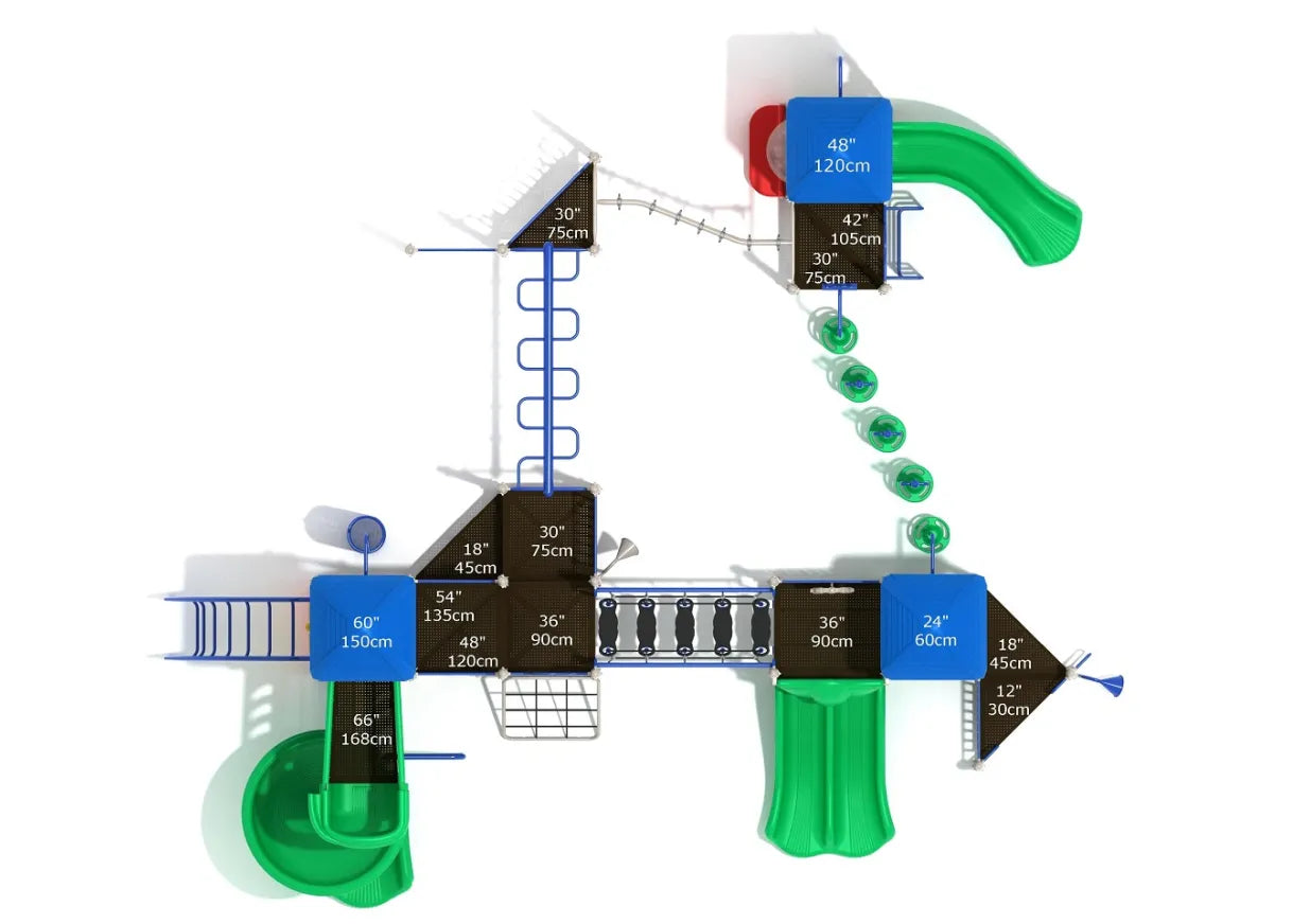 Watch as kids race across the wobbly Suspension Bridge to get to the main platform of the Cottonwood which is packed with fun features. A Straight Overhead Snake Climber and Zig Zag Overhead Swinging Rings provide the perfect opportunity for some monkey business as they hold on tight and learn to swing their bodies while grabbing the next bar or hoop. There’s a pair of Talk Tubes installed on the play set to encourage social interaction, and kids will really love the multiple Pod Climbers as a way to move between structures. A Net Climber and Inverted Arch Climber provide the perfect way to scale the play equipment, and once they reach the top they can choose from a Double Slide or a twisting Spiral Slide for more fun. On the smaller structure, there’s a Right Turn Slide as well as a Fireman’s Pole to slide down. When they simply can’t decide what to do next, there’s a Wheel of Activity Panel which can be spun around to tell them which adventure to go on next.
