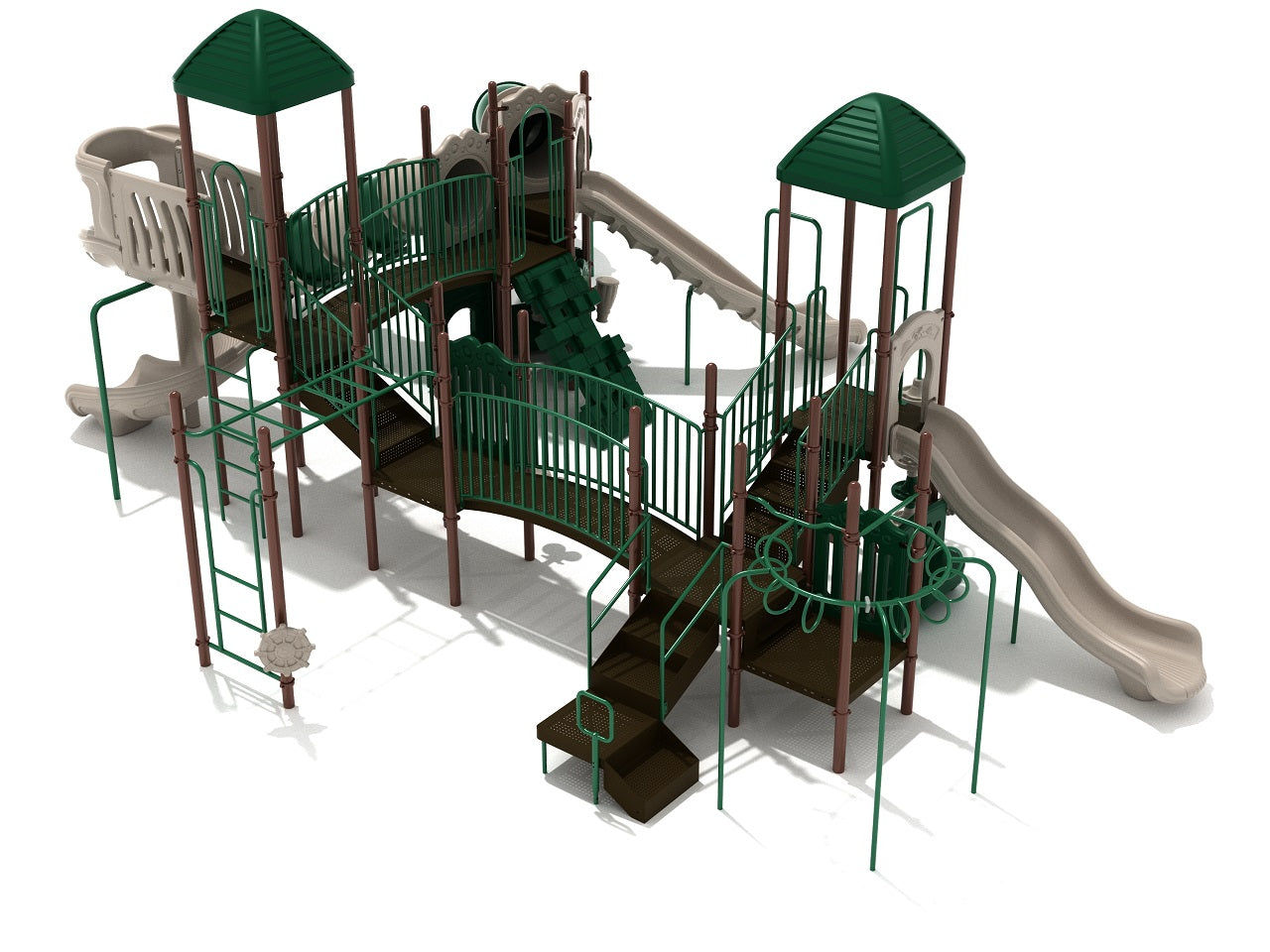 With multiple climbers, slides, and activities, the Galveston play system is no less than a playground paradise for kids. First off, climbers like Snake Climber, Pixel Climber, and Pod Climber are there to challenge the strength of kids and build their upper body muscles. The deck is very spacious and big, so kids can walk between multiple bridges and say hello to their partners or parents while enjoying the overall experience. After getting up on the deck through climbers, kids can choose between a range of slides to come down, including Wave Slide, Spiral Slide, Left Turn Slide, Simple Tube, and Curved Tube Slide. The fun does not stop here! The 270-degree overhead rung ladder adds to the fun and lets kids swirl like monkeys to complete the play-loop structure. No matter what, adventure and thrill are always there in Galveston. It can accommodate up to 94 children at once.