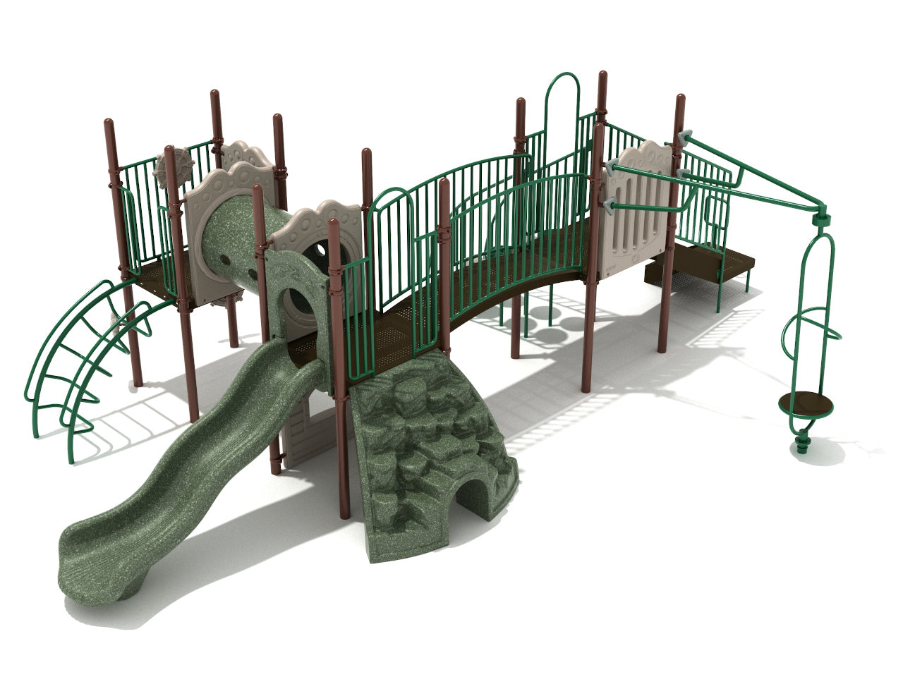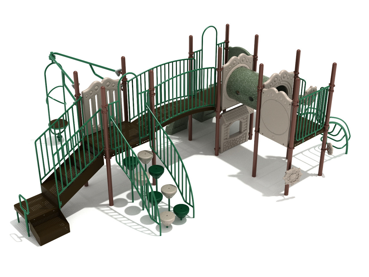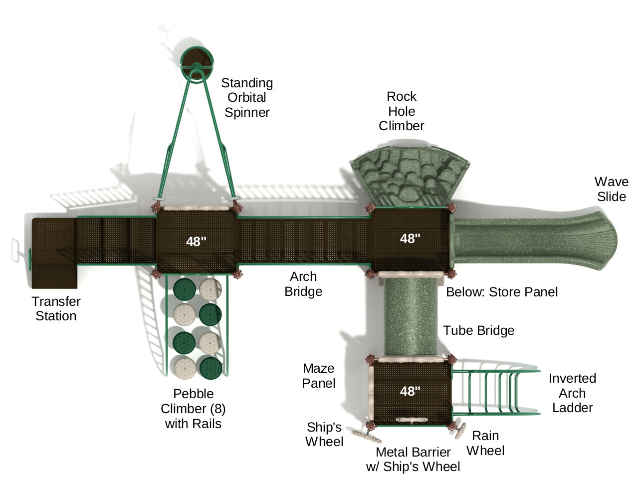 The Grand Rapids outdoor play equipment has been designed to stimulate kids in a variety of ways whether they’re whizzing around fast on the Standing Orbital Spinner, maneuvering a rock face on the Rock Hole Climber or playing pretend on the Store Panel. The Pebble Climber with Rails features 8 circular platforms with a tactile surface for excellent traction and helps children to learn how to balance as they step forwards and upwards at the same time. An Arch Bridge links the two sections and could easily be a pathway across a raging river below before children have to clamber through the Tube Bridge which has small holes to spy out of. A long Wave Slide offers a bumpy ride below and an Inverted Arch Ladder will be easy to climb up but not so easy to get down backwards. There’s a Metal Barrier with Ship’s Wheel on the lookout deck above for the captain and another one directly below for the first mate when it comes to steering the Grand Rapids down a river, out to sea, or even into space.