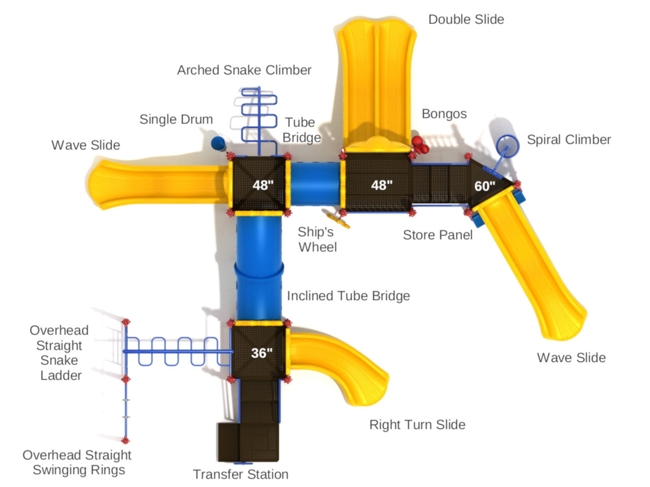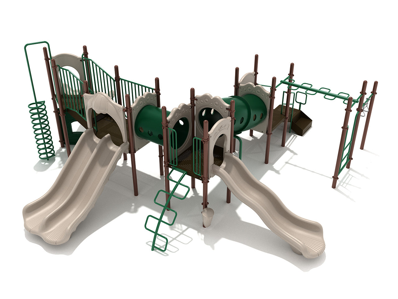 The Grand Venetian lives up to its name as it’s a massive play structure that children will be bowled over by. The Grand Venetian has so many ways to play and children can get onto the structure by using the Spiral Climber to twist their way up, the Arched Snake Climber for boosting hand-eye coordination or by swinging to the platform using an Overhead Straight Snake Ladder. Budding gymnasts can twist, spin and turn on the Overhead Straight Swinging Rings and future musicians can get an early start on the Single Drum or Bongos on the ground level. There is a Tube Bridge as well as an Inclined Tube Bridge that requires more skill to navigate. Four fun slides to choose from boost the fun factor, and whether they choose the Wave Slides, Right Turn Slide, or Double Slide for racing down, they’re sure to have a blast. A Store Panel makes shop role-playing possible, and there’s even a Ship’s Wheel to steer the fun in multiple directions.