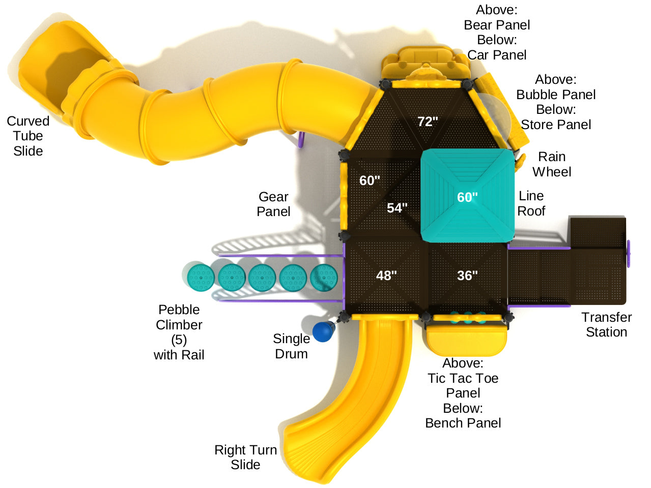 Set across multiple levels, the Helena playset has a happy Bear Panel on the top platform to watch over the fun as well as a Bubble Panel to sit inside and get a great view of friends playing below and a Gear Panel which allows children to see how cogs interact with each other. The Tic Tac Toe Panel for friendly competition and problem solving is on the next level down and below that is a Bench Panel for friends on the other side to watch the game or just take a well-deserved break from all the action. On the lower level children can explore a Rain Wheel and Single Drum for an auditory experience. There’s even a Store Panel for imaginative role-playing and a Car Panel so they can head off on a road trip together. There’s a five-piece Pebble Climber with a rail on either side to provide balance, and once they reach the top it’s time to whizz down the huge Curved Tube Slide and emerge onto the playground below. Younger children and infants may prefer to enjoy the Right Turn Slide on the lower level.
