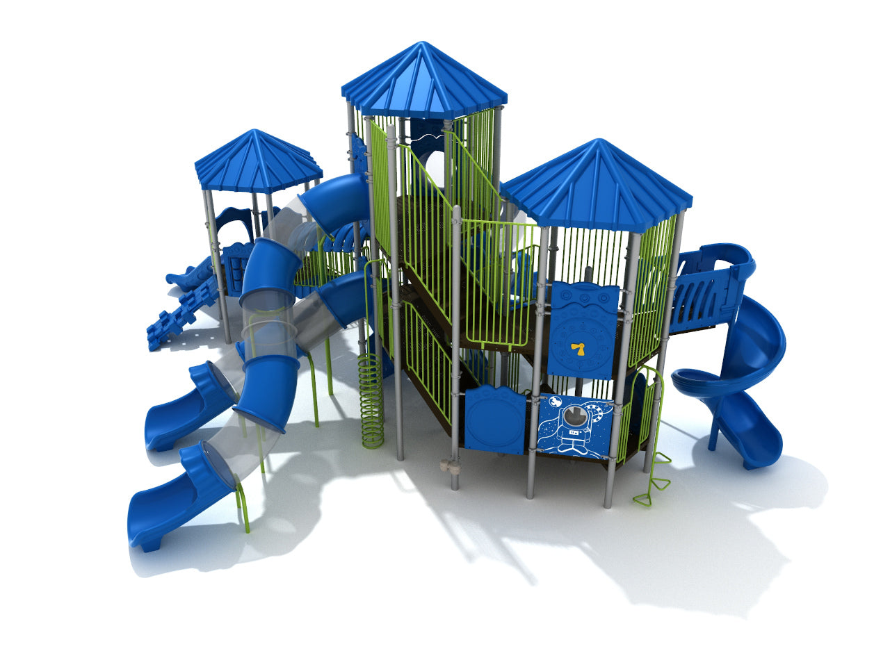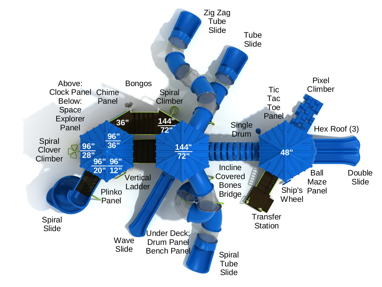 Spread over multiple levels and standing like a huge castle of adventure in the playground, the Kings Gate is the ultimate in adventure play. Kids will adore discovering the different elements of this set and under three Hex Roofs there’s so much to explore like the Incline Covered Bones Bridge and Chime Panel. A Double Slide, a high Wave Slide and a Spiral Slide let children slide down with the wind in their face, but there’s also a covered Tube Slide, Spiral Tube Slide and a Zig Zag Tube Slide which offer a sensory experience that is sure to make happy memories. Multiple ways to climb up include the 3D cubed Pixel Climber, a Spiral Climber and a Spiral Clover Climber which offers an interesting variation designed to challenge young minds. For younger children who flourish with creative and imaginative play the structure has several panels. They can have a game against friends on the Tic Tac Toe Panel, navigate through the Ball Maze Panel and blast off into space on the Space Explorer Panel.