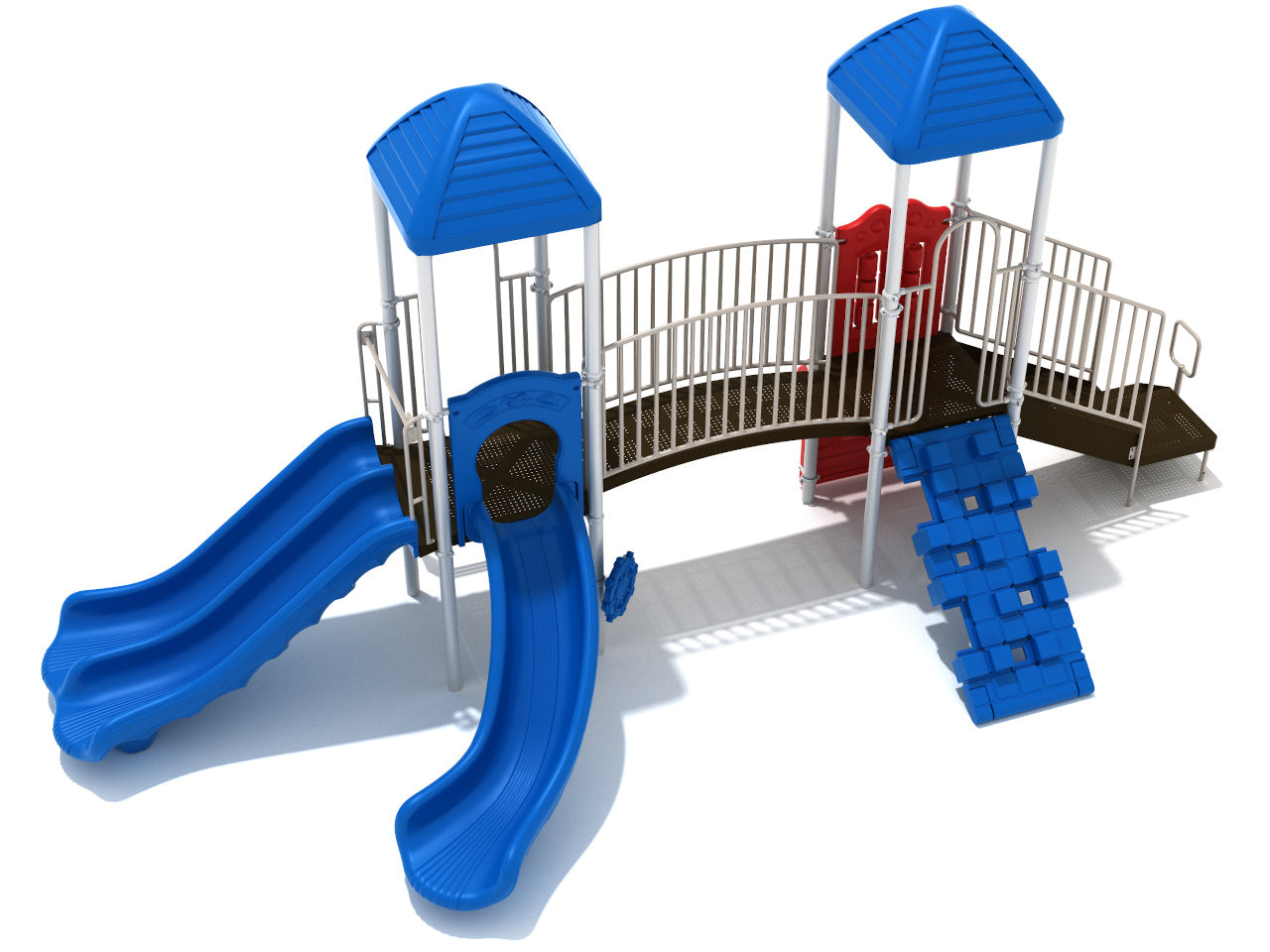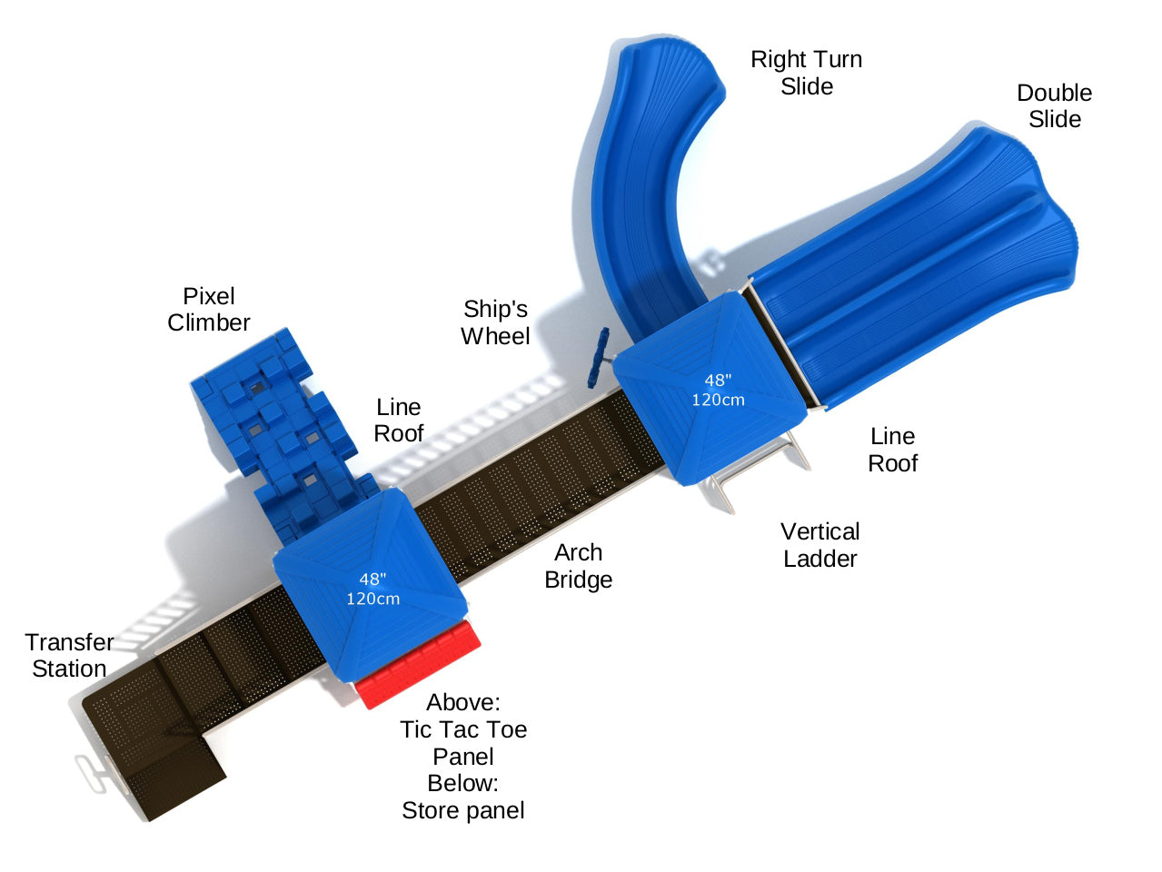 Kids will love the diversity of adventures that can be enjoyed on the Lake Placid play structure. They can try their luck at climbing the Pixel Climber created with 3D squares and holes designed to test motor skills and hand-eye coordination, or if they want to get straight to the action quickly they can opt for a simple Vertical Ladder or the Transfer Station entrance. After a few games on the Tic Tac Toe Panel kids can make their way over a gushing river below using the Arch Bridge to reach two slides. Directly in front they’ll find a Double Slide so they can grab a friend and have a race with them, or they can choose the Right Turn Slide to slip down a gently curving waterfall into the water below. On the ground level children will discover even more fun with a Ship’s Wheel to sail the high seas or become a swashbuckling pirate. There’s also a Store Panel with a plastic roof replicating tiles and stonework around a central window where they can sell everything from mudpies to chunks of wood mulch.