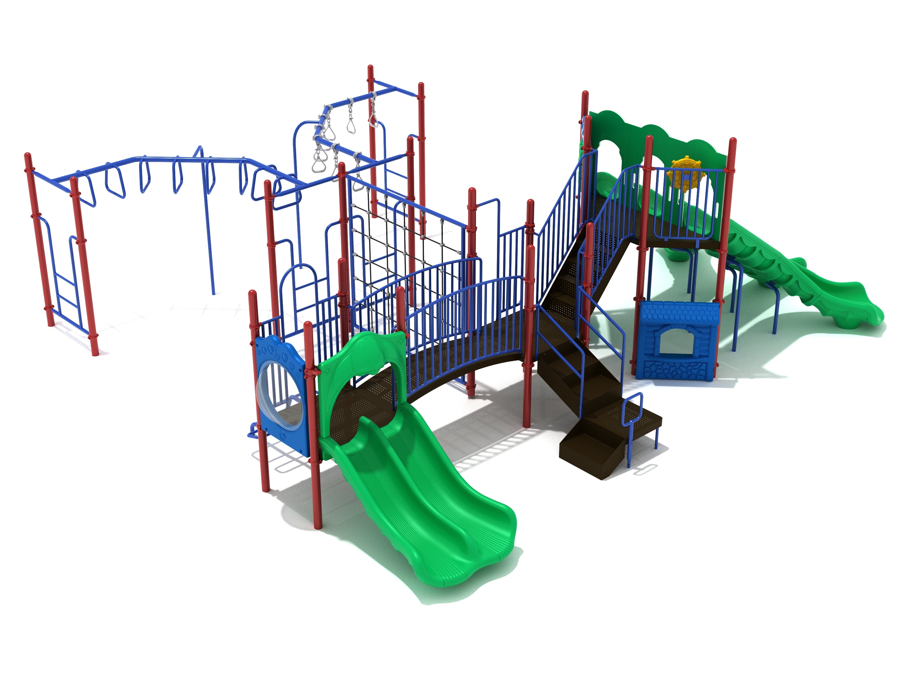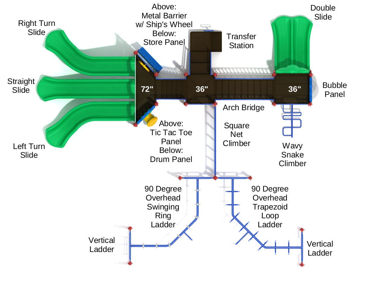 There’s no shortage of captivating features on the Manhattan play set with a main structure featuring multiple slides and an additional climbing frame and monkey bar section. On the platforms of the main structure kids can race each other down the three end slides or use the Double Slide at the other side. An Arch Bridge links the two sections together and there’s a Wavy Snake Climber for young adventurers to slither their way up. Interactive panels bring a new element of fun and children can play on the Tic Tac Toe Panel or explore outer space through the window of the Bubble Panel. For a more physical experience, kids can challenge themselves on the 90 Degree Overhead Trapezoid Loop Ladder or the harder but even more fun 90 Degree Overhead Swinging Ring Ladder. Both can be reached by a Vertical Ladder at the end and once they’ve finished they can scramble across the Square Net Climber to the main structure to continue the fun.