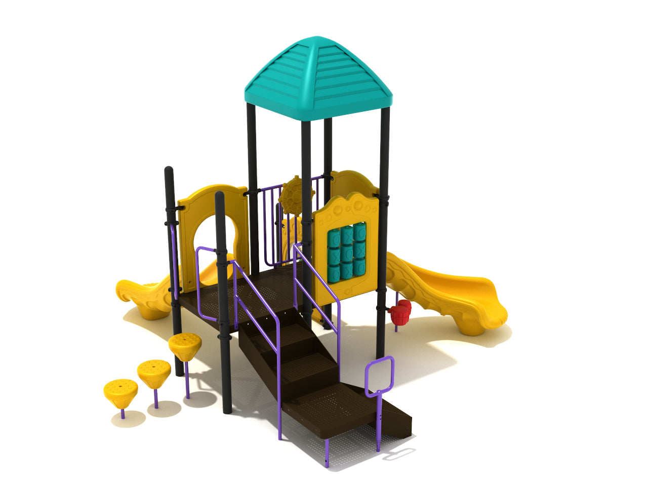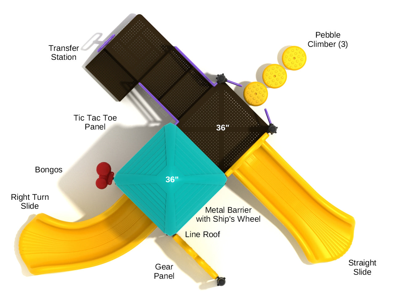 There’s lots to love about the Miami Beach play structure with lots of exciting things to do for younger children just beginning to explore playgrounds and also for older kids who thrive on challenging play equipment. A Tic Tac Toe Panel brings this classic game to live in 3D with spinning symbols to play the game over and over. A Gear Panel and Ship’s Wheel make the play experience more interactive as they investigate turning motions, and Bongos are always a favorite of children whether they’re making music or just creating playful noise. Climbing up to the platform is given a fun twist thanks to the Pebble Climber. It’s a series of three disks with a textured surface to prevent slipping which encourages good balance and kids can pretend they are crossing a river on stepping stones. A Right Turn Slide and Straight Slide complete the structure and give children the opportunity to choose which one they want to go down first, but you can guarantee that both will be used time and time again.