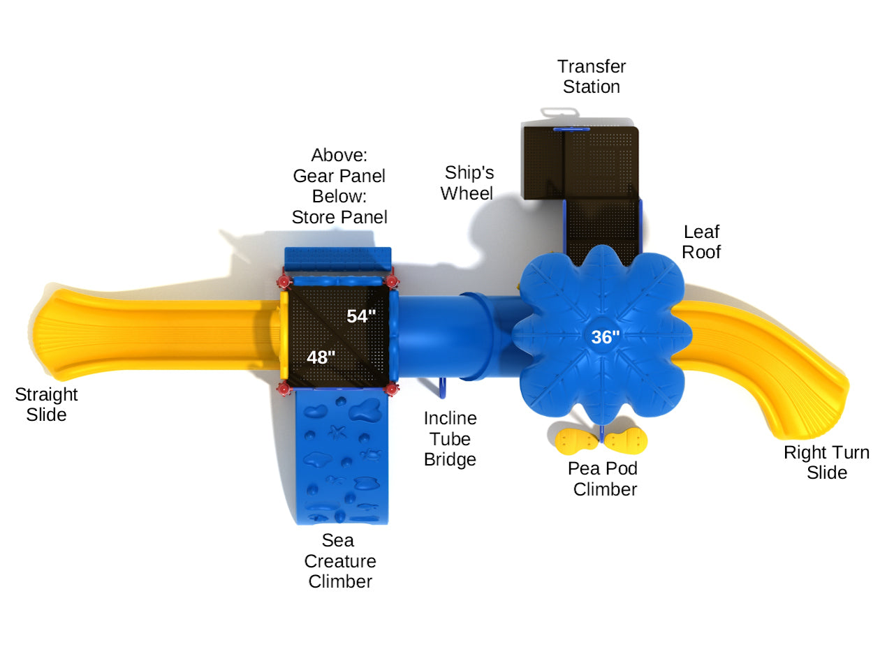 The Provo play set brings an exotic experience with many awesome features included under the tropical Leaf Roof which provides shade in summer and also shelter from rain showers. The Sea Creature Climber is an inventive way to get to the upper platforms by using indented spaces for foothold and 3D starfish and shells for handholds to propel them upwards. Adjacent to this is the Pea Pod Climber which features leaf-like platforms extending from the sides like a growing plant. When they’ve completed their climb children are presented with numerous options to enjoy including an Inclined Tube Bridge where children can pass each other on hands and knees, a Straight Slide to whizz down fast or a Right Turn Slide to add a twist to their descent. A Store Panel and Ship’s Wheel inspire adventure and creative thinking while the Gear Panel offers a tactile experience with colorful turning cogs. Withstands many years of outdoor use and requires minimal maintenance.