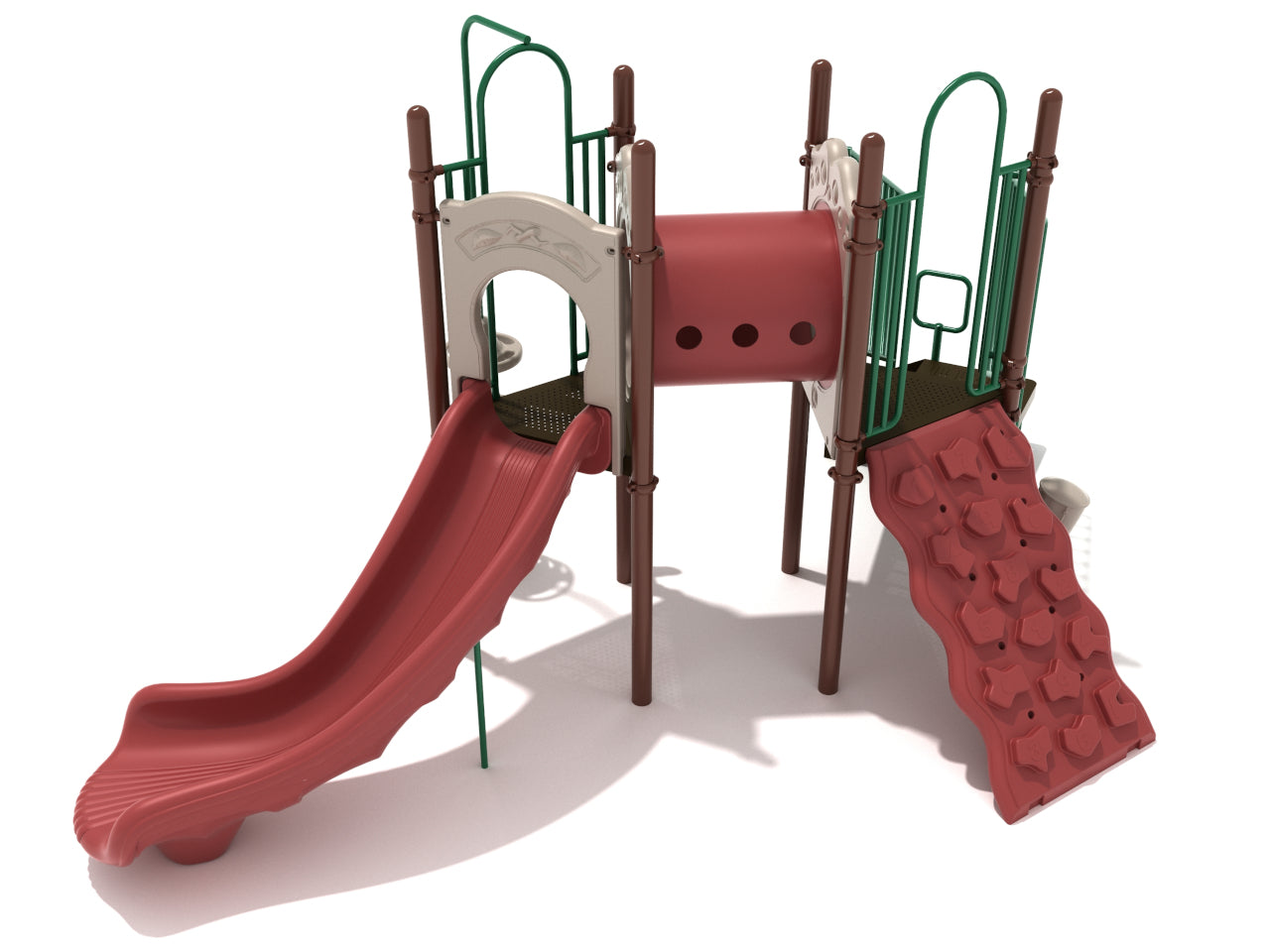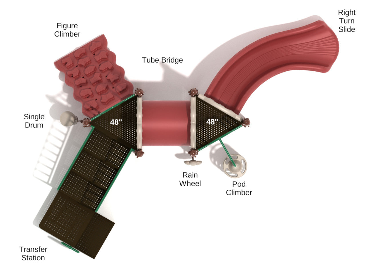Starting at the Transfer Station entrance, kids can run and crawl their way through the covered Tube Bridge before twisting down the Right Turn Slide towards the ground. For kids thirsty for adventure there are two other ways to access the upper deck. A Pod Climber lets children use the circular platforms to stand on and the spaces are just the right size for small hands to pull themselves up. The Figure Climber on the other side of the structure places kids on the side of a rocky mountain as they grapple their way up the angular holds to reach the triangular platform. It’s even trickier trying to get down this way backwards as their feet will swing around looking for a suitable hold. A Rain Wheel is affixed to the bottom pole which can be spun around fast to create the sound of whooshing water and a Single Drum brings a welcomed sense of rhythm and melody to playtimes.