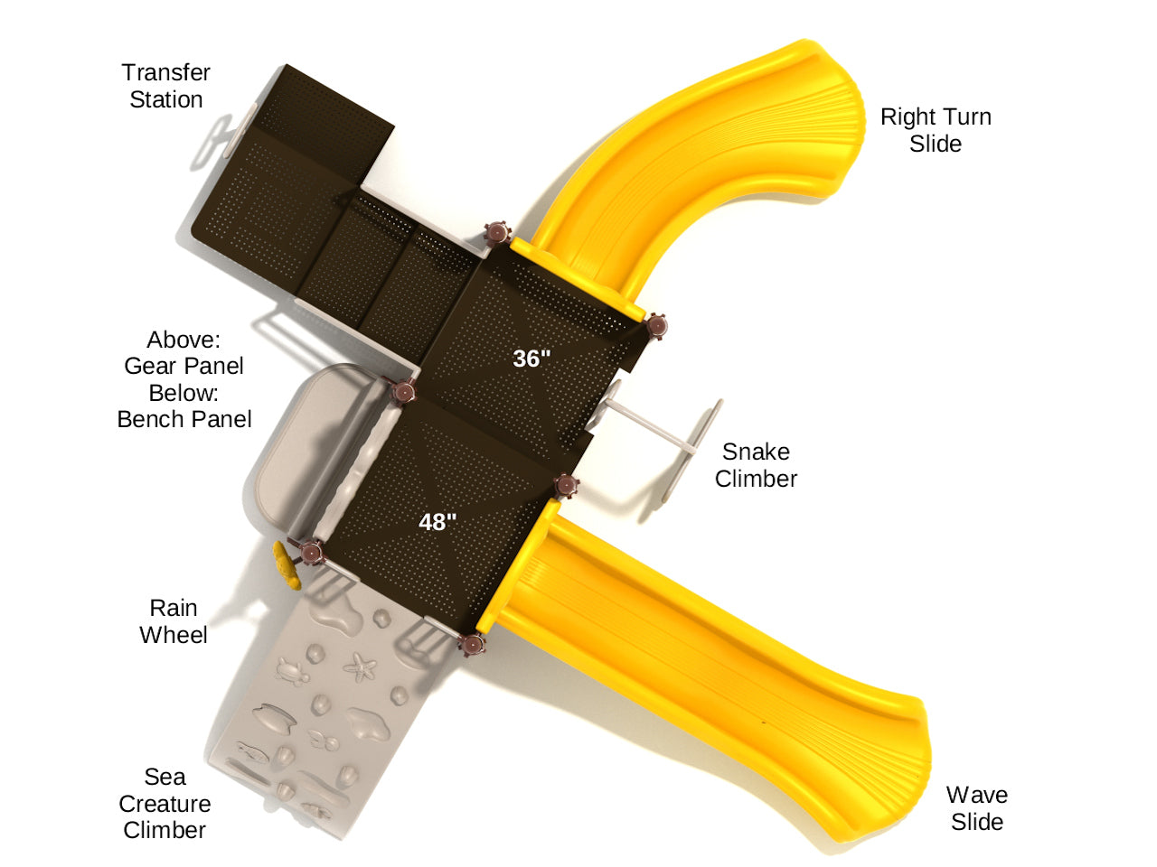 Children will be able to amuse themselves whether for a quick fifteen-minute recess or an hour-long play session on the Reno play equipment. They can pretend to climb up thick jungle vines as they scale the Snake Climber which features a twisted design that allows children to experiment with hand-eye coordination for foot and hand placement. A deep sea adventure awaits on the Sea Creature Climber where children can use the 3D shapes of jellyfish and starfish to move up or down the section. At the top of the platform there’s an interesting Gear Panel featuring multi-colored gears and below there’s a Bench Panel to get some respite from all the running and playing. Kids can choose from two fantastic slides too, a Right Turn Slide to provide an angled experience and a Wave Slide that will make them bump and jiggle as they head towards the ground below. For children who like to enjoy the sensory aspect of play, a gentle spin of the Rain Wheel will make it sound like raindrops are falling.
