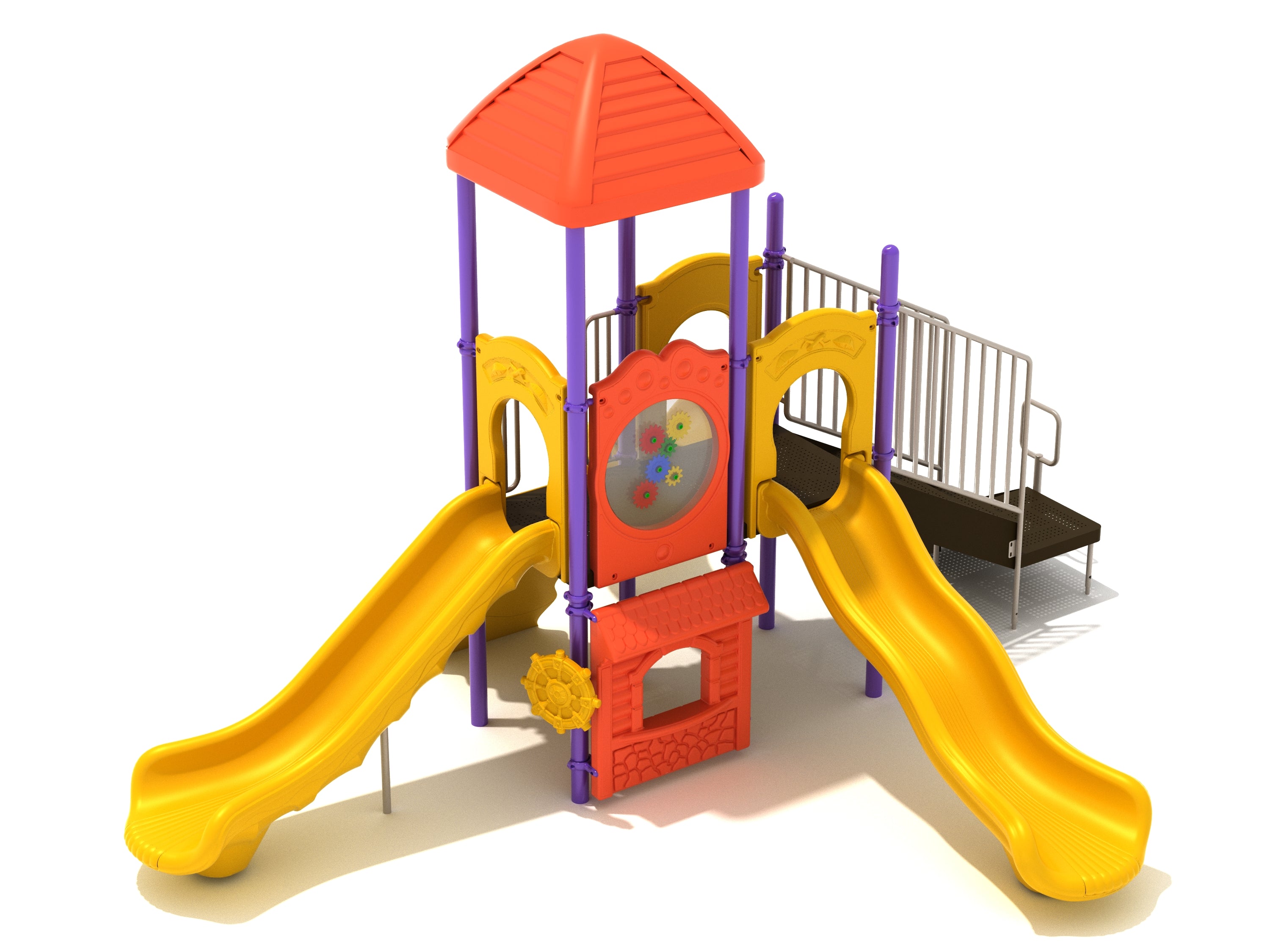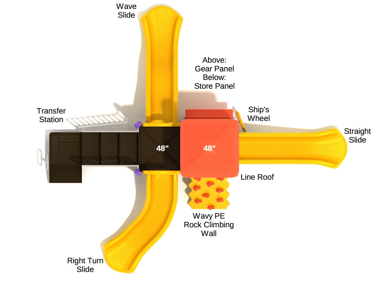 Children can ascend to the upper platform via the Transfer Station which features a gradual slope or test their skills on the Rock Climbing Wall. Kids will love to test their ability to scale this alternative to a ladder and pretend they’re working their way up a mountainside using the knobbly grips for hands and feet. When they reach the top there’s a Gear Panel directly in front that can be spun round to show how multiple cogs can work together to create motion. There’s a Line Roof above so no matter whether they need shelter from the rain or sun’s rays they have that protection. Three slides emerge in all directions from the San Rafael and whether they choose the fast Straight Slide, twisting Right Turn Slide or the bouncy Wave Slide they will love to experience it over and over. Creativity is inspired with a Store Panel underneath where children can go shopping for groceries or be the seller taking payments and cashing in coupons. They can also pretend to be sailors on rough seas with the addition of a Ship’s Wheel.