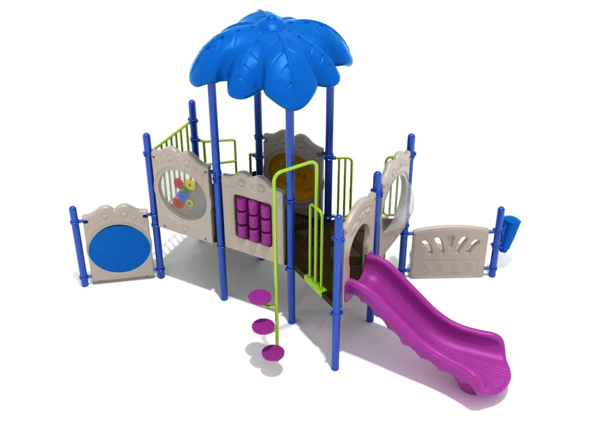Children will love to race around the Santa Clara play equipment and discover everything it has to offer. It brings a fun aesthetic to any playground thanks to additions like the Bear Panel with a happy 3D face and the large Leaf Roof which can ignite creativity as well as providing shelter from the sun and rain. Children are sure to have a fun time here whether they’re pretending to be underwater adventurers looking out of the submarine Bubble Window Panel, on a space rocket tinkering with the Gear Panel or using the Disc Climber to scale the side of a mountain. Musical children will love the huge Drum Panel and Single Drum, but every child will love to race down the Straight Slide no matter the age. Coordination and thinking abilities will be heightened thanks to the Tic Tac Toe Panel which encourages friendly competition too. There’s lots of upper space to play on thanks to the multiple panels, or children can find respite on the Bench Panel to take a break from all the fun.