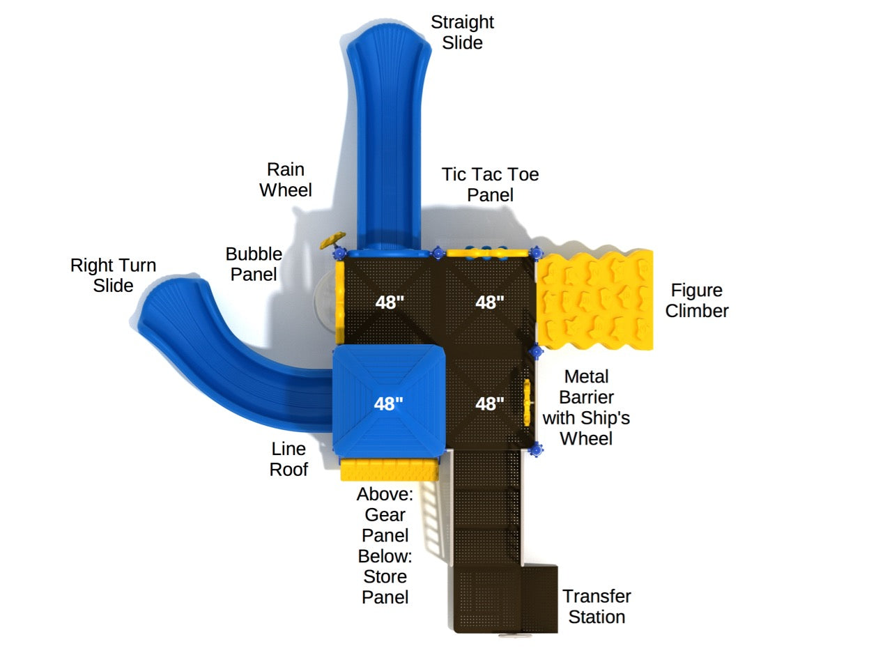 Children can choose to use the Transfer Station of the Sioux Falls play structure to reach the large and spacious upper platform or they can tackle the rocky Figure Climber featuring many hand and footholds which allow for problem-solving to combine with hand-eye coordination. On the upper deck there’s an abundance of play options from the Metal Barrier with Ship’s Wheel to allow children to captain their own boat or spaceship to a Gear Panel if they love the tactile experience of moving colorful cogs. Learning how to play basic childhood games is important for development so the addition of a Tic Tac Toe Panel encourages cooperation with their peers and develops critical thinking. From this lofty position kids can enjoy sliding down the Straight Slide towards the Rain Wheel underneath, or opt for the Right Turn Slide next to the Bubble Panel. There’s nothing young children love more than role-playing, and the Store Panel gives them the perfect opportunity to do that.