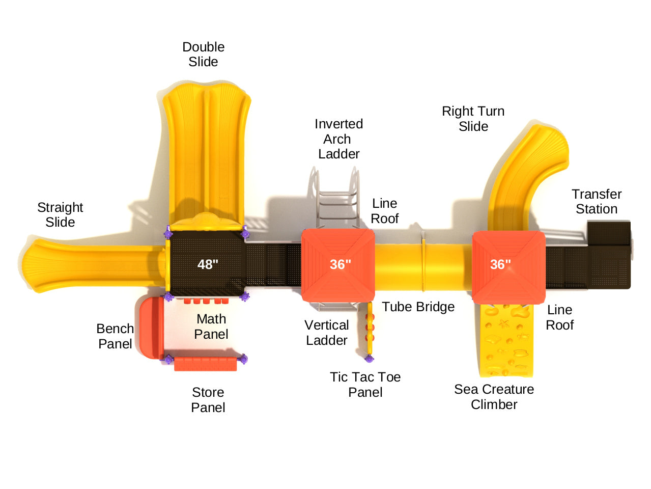 This system has 4 slides that justify the name Steamboat Springs. A Tube Bridge connects its 2 decks so kids can navigate the structure with ease. It’s like going on a fun and crazy steamboat adventure in the River Mississippi. 2 Line Roofs cover the whole thing, and Roof #2 has two ladders on both sides. These ladders allow for easy climbing and descending, or kids may also climb via a Sea Creature Climber. An ever-present Tic Tac Toe Panel makes its appearance at the end of the Tube Bridge, which children can access using the Vertical Ladder. Children can exit via 3 slides or sit in a comfy clubhouse attached to the Steamboat Spring. Behind the Bench Panel, there’s a Math and Store, which kids can use to engage in creative gameplay. Steamboat Springs can accommodate up to 48 kids at once. It is perfect for mid-sized play areas and can keep kids entertained.