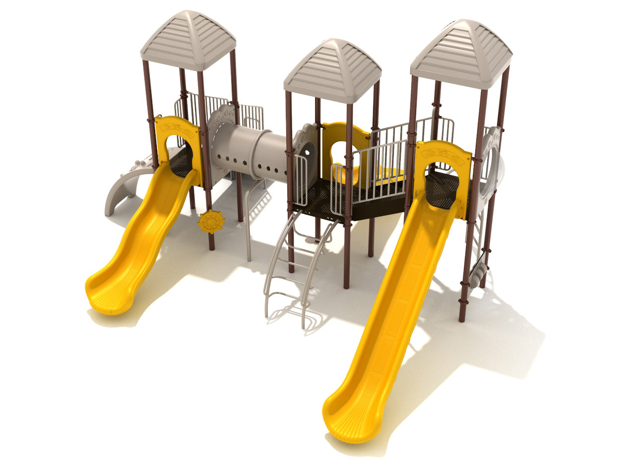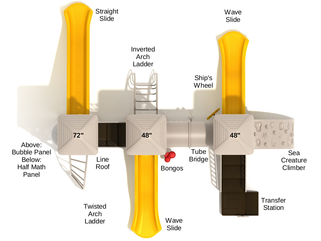 The Thibadaux is a neat arrangement of three decks, each connected to a slide and one or more climbers. There is a line roof covering each deck, giving Thibadaux a charming hut-shaped appearance. The entire play structure has strategically installed railings all across to keep kids safe on 4-foot and 6-foot tall heights. The two 4-foot wave slides are perfect for younger kids seeking a bit of bumpy fun, while the taller 6-foot Straight Slide provides a thrilling descent for the more daring. To make even moving between decks fun, there’s a Tube Bridge to crawl between these two slides. Climbing is another big source of fun in Thibodaux. The most challenging climb is offered by the decorated Sea Creature Climber, followed by the Twisted Arch Ladder and Inverted Arch Ladder. Those wanting an easy way up can always use the traditional Transfer Station stairway. Thibadaux also has features like Ship’s Wheel, a pair of Bongos, and a Half Math Panel to engage kids on the ground too.