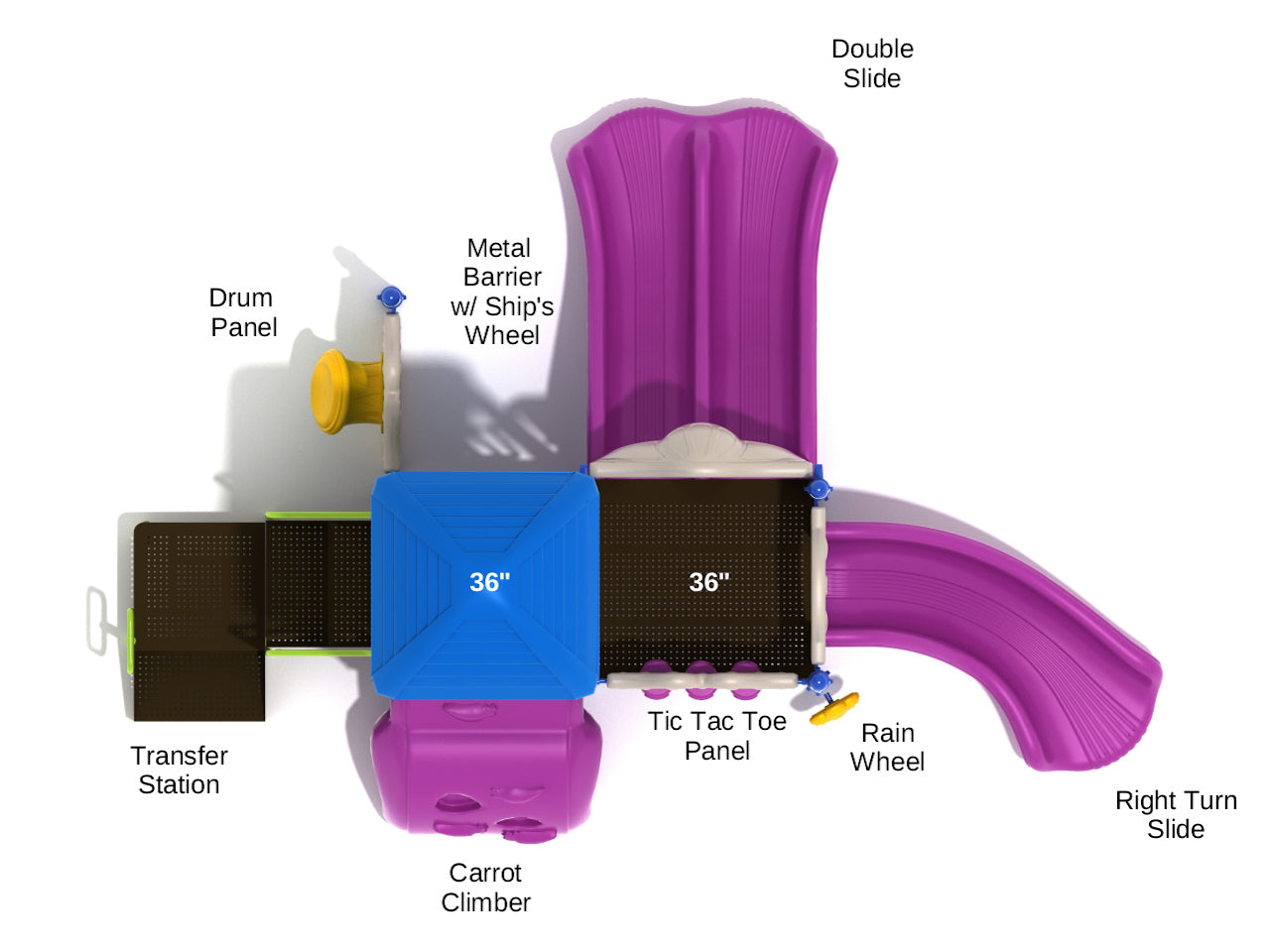 Watch as children tackle the many aspects of this play structure with glee. From working their way up the Carrot Climber by using footholds and 3D vegetables to sliding down the Right Turn Slide, kids will be sure to have a blast whether they’re playing on the Towson for a quick recess break or for hours in a public park. The structure is designed to encourage sharing and collaboration with friends in many ways, including a Double Slide for one-on-one racing and a Tic Tac Toe Panel which also helps them develop problem-solving skills. There’s a Line Roof to shelter children from the rain and sun, but even if it’s not raining the experience can be replicated with the fun Rain Wheel that can be spun round and round to create the sound of trickling raindrops splashing on the ground. A Drum Panel generates a booming sound when hit with sufficient energy, and the Metal Barrier with Ship’s Wheel on the upper deck under the roof gives an excellent view of the playground just like a captain standing on a ship’s bridge to navigate the seas.