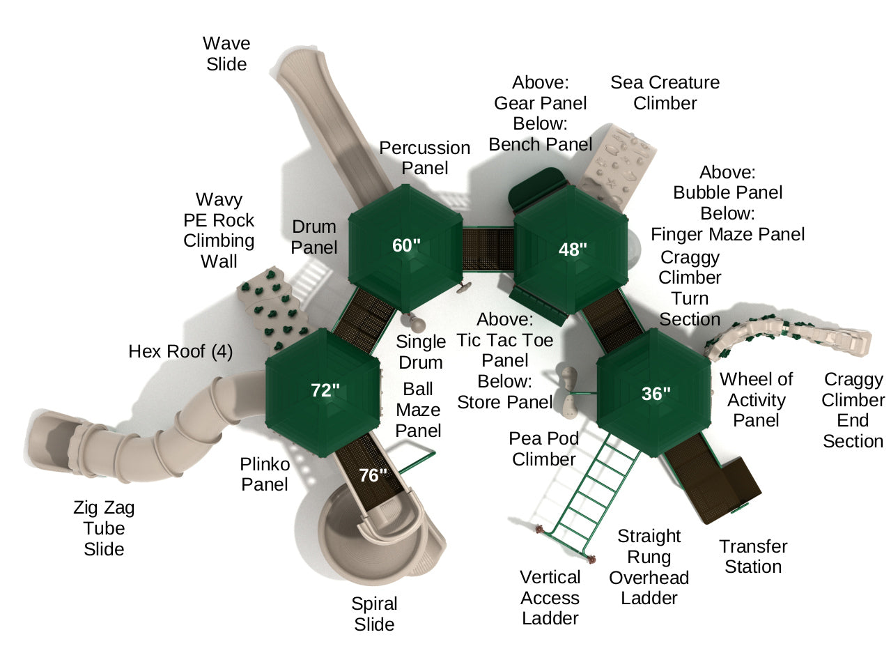 Four hexagonal platforms with matching Hex Roofs are the center of good times for children of all ages. The first platform features a huge Zig Zag Slide Tube and a Spiral Slide for swirling adventures as well as a Ball Maze Panel to navigate and a Wavy Rock Climbing Wall to scale the heights of the structure. The second and third panels boast a Wave Slide and Sea Creature Climber which has turtles and starfish on to inspire kids. They have multiple panels including a Percussion Panel to drum out some beats, a Gear Panel to show kids how basic mechanics work, and a Tic Tac Toe Panel for the classic childhood game to be played. The final hexagonal platform requires lots of physical activity from energetic young bodies as it has a Straight Rung Overhead Ladder to swing across and a Pea Pod Climber. Attached to this end section there are also two Craggy range sections, a Craggy Climber End Section that helps children get on to the more difficult Craggy Climber Section.
