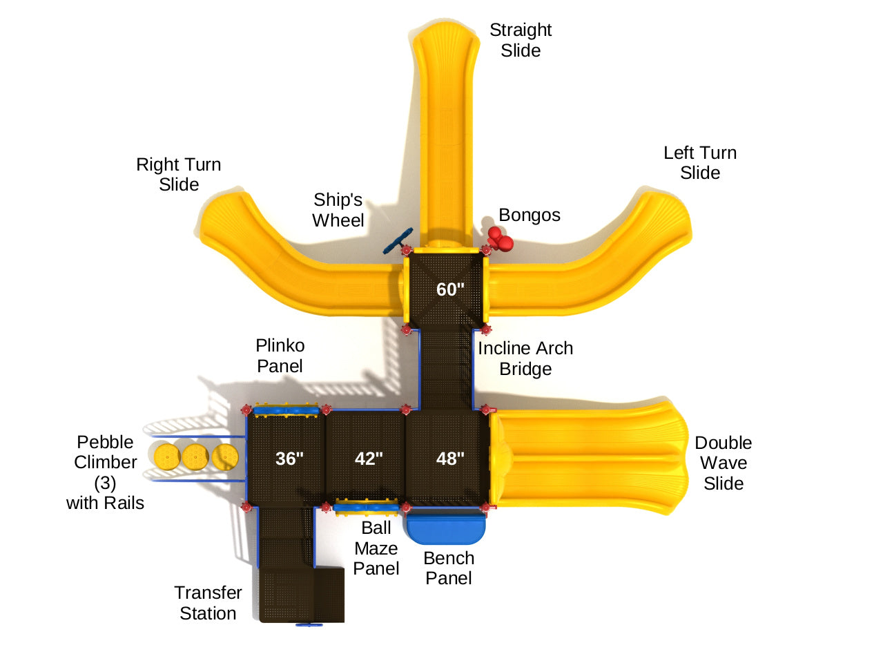 The Tuscaloosa has long slides spread out like an octopus’s tentacles with only one corner reserved to climb the structure. The climbs are quick and easy thanks to the simple Transfer Station and a little challenging yet safe Pebble Climber with Rails. Before heading to the slides, kids will be drawn towards the score-based Plinko Panel game and the slightly different Ball Maze Panel. If these are occupied, kids can race down the Double Wave Slide and enjoy its bouncy effect on their way down. The rest of the kids can flock to the launching pad a little higher, shared by three different slides. A trio of competitive friends can use this opportunity to take these slides at once to see who finishes first. Tuscaloosa is also considerate of tired kids with its placement of a Bench Panel for kids to rest and recharge for their next ride. However, if they still have energy to spare, they can enjoy playing the Bongos or steering the Ship’s Wheel.