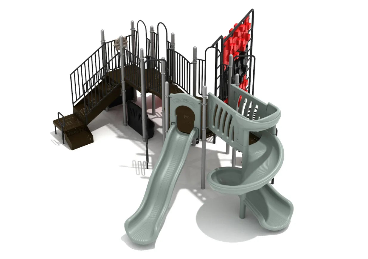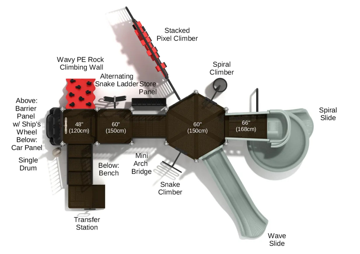 Standing tall above the playground like a futuristic moonbase, the first thing kids will notice is the huge Stacked Pixel Climber. Offering an alternative to a traditional climbing wall, this structure has lots of 3D cubes and square holes for children to put their hands and feet on. There’s also a Wavy Rock Climbing Wall for younger children to practice on as well as an Alternating Snake Ladder and a Snake Climber to reach the upper deck. Once they’ve climbed up using the Spiral Climber they can take a dizzying ride down again on the Spiral Slide or if they’ve had enough twisting fun they can opt for the Wave Slide instead. Play panels complete the structure and children can choose to roleplay on the Store Panel, drive the Car Panel with their friends, or play captain on the Barrier Panel with Ship’s Wheel. A Mini Arch Bridge adds an element of fun and a Bench Panel is perfect for encouraging social interaction.