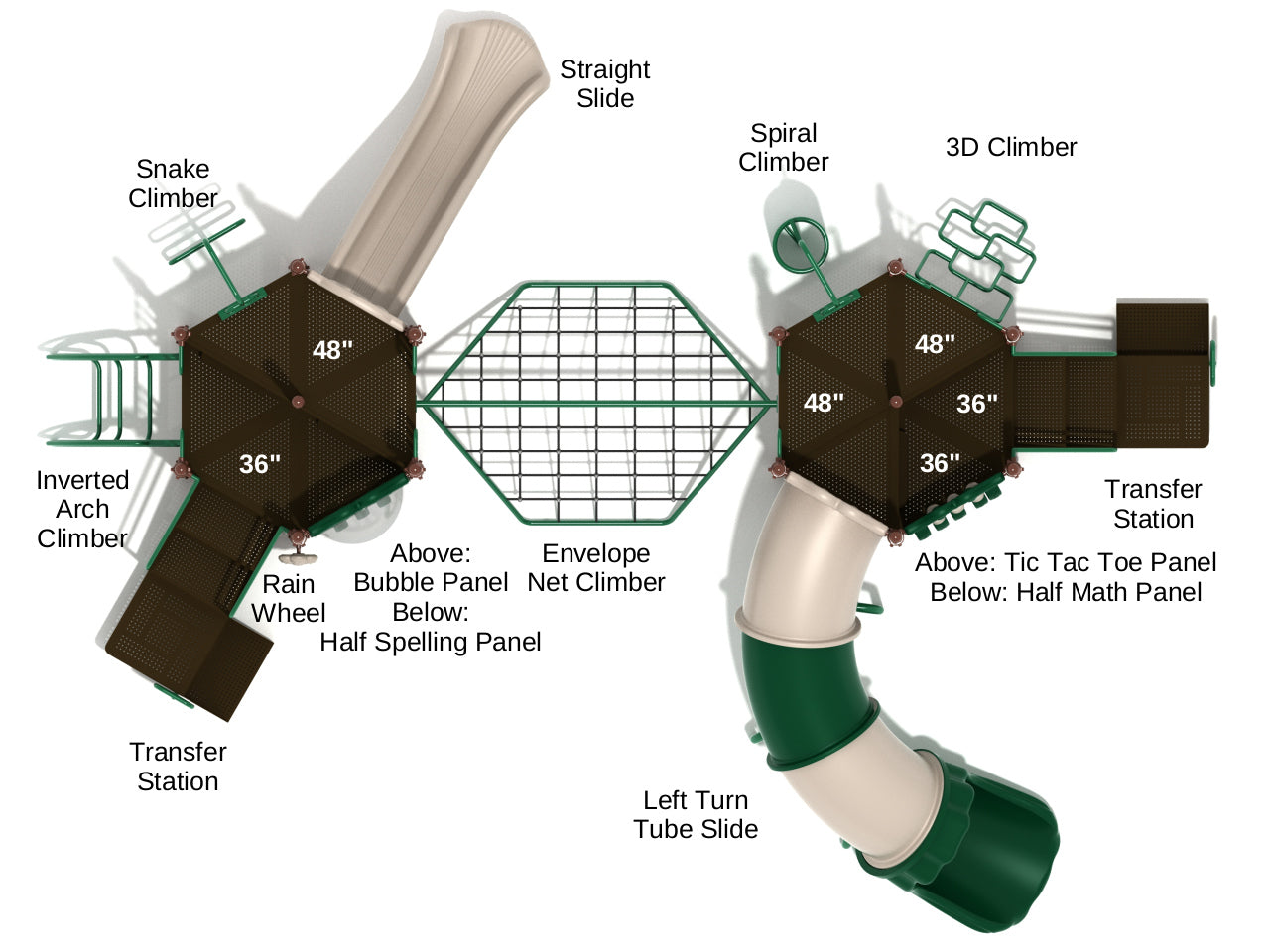 Designed to help kids develop in numerous ways, the Twinsburg provides a huge amount of mental and physical stimulation as well as educational opportunities. Joined by an Envelope Net Climber frame which has a triangular structure to crawl up and over or through, there are two hexagon platforms each with their own fun activities. On the first platform kids can enjoy climbing up via the Inverted Arch Climber or Snake Climber using skill and dexterity, but then they get to enjoy a fast Straight Slide down again. There’s a Bubble Panel to pretend they’re on a moonbase or submarine, and a Half Spelling Panel to improve literacy. The other platform features a twisty Spiral Climber and a tricky 3D Climber to scale up with and Left Turn Tube Slide for the descent. It also features a Half Math Panel to introduce children to numeracy and a Tic Tac Toe Panel for fun games.